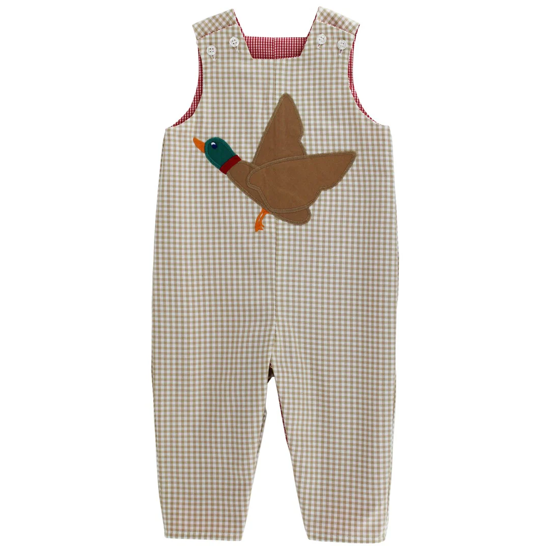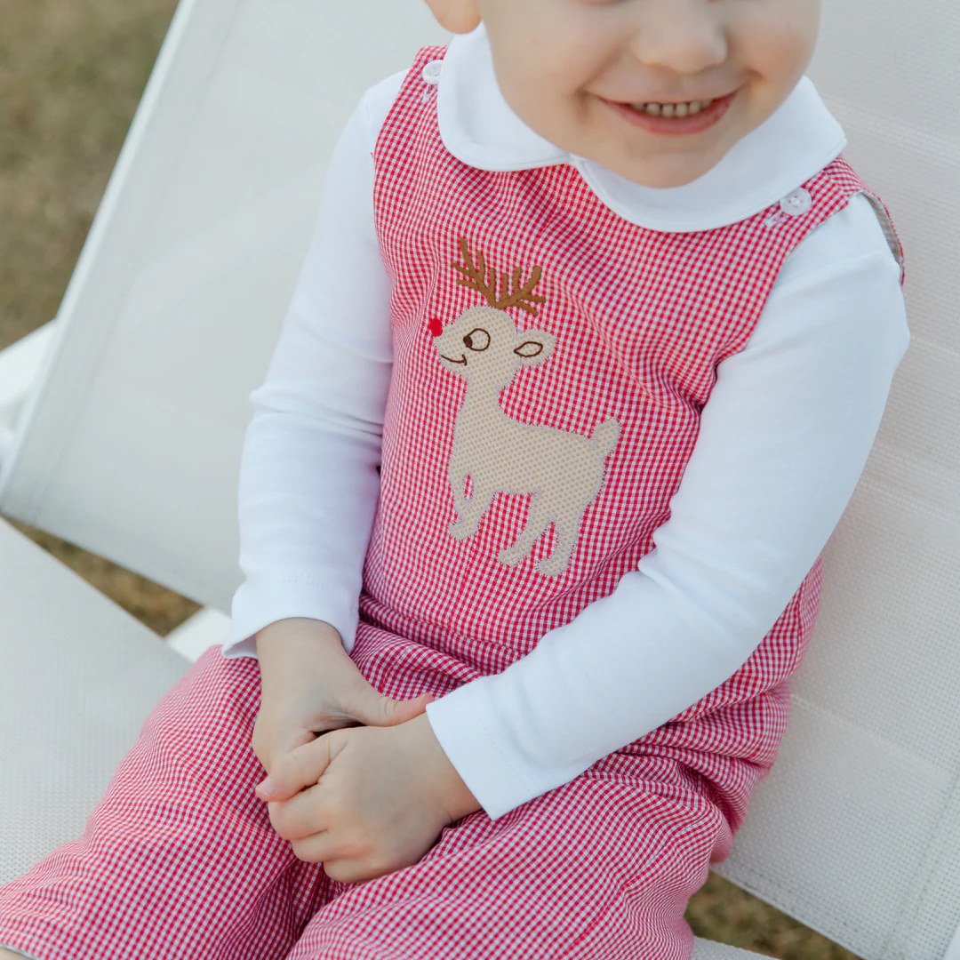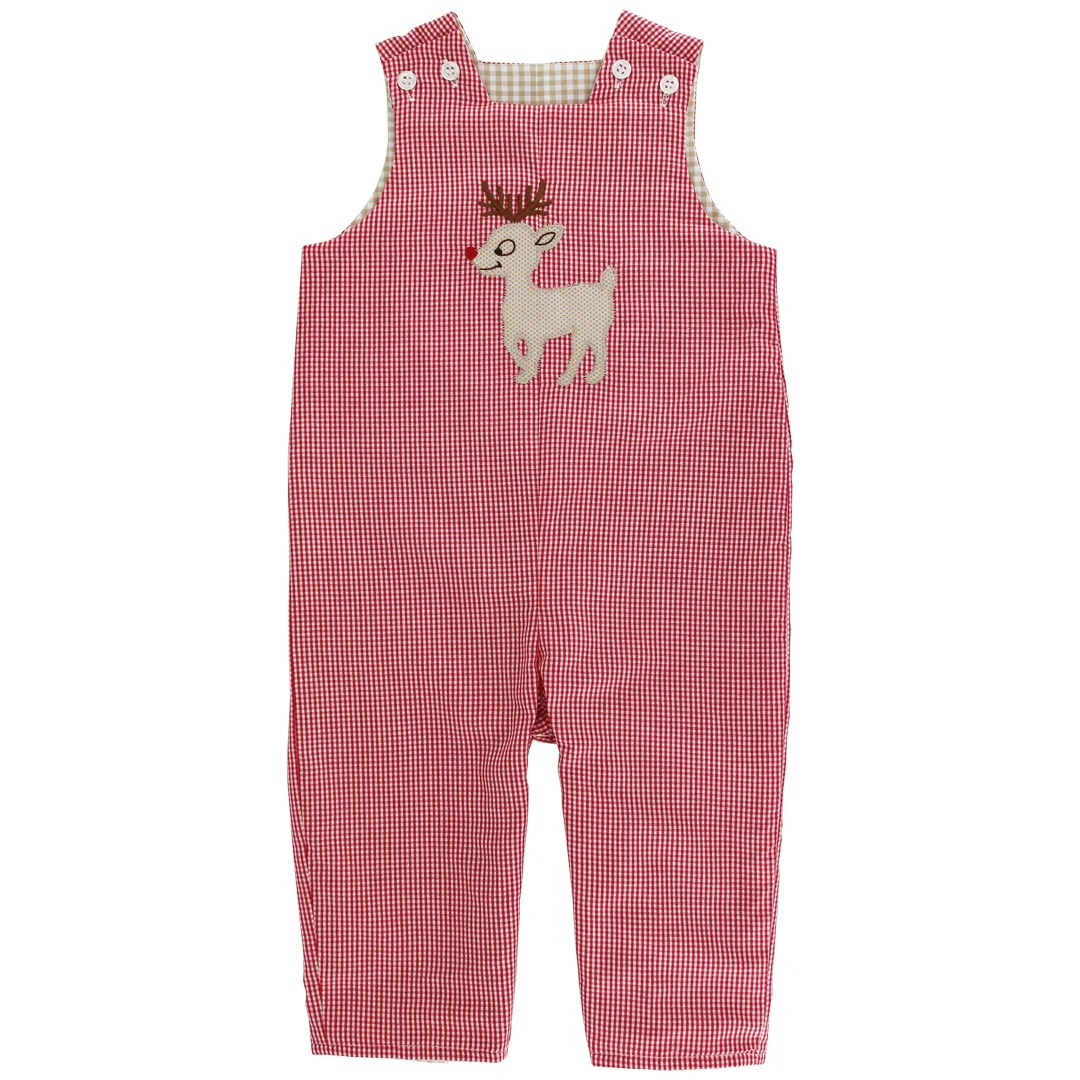 The Reindeer Games Reversible John John offers two charming looks in one! One side features a playful reindeer design while the reverse provides a classic seasonal pattern. Crafted in soft fabric for all day comfort this versatile piece is great for festive outings and Christmas photos. Buttons at the shoulders and snaps at the legs make dressing a breeze.