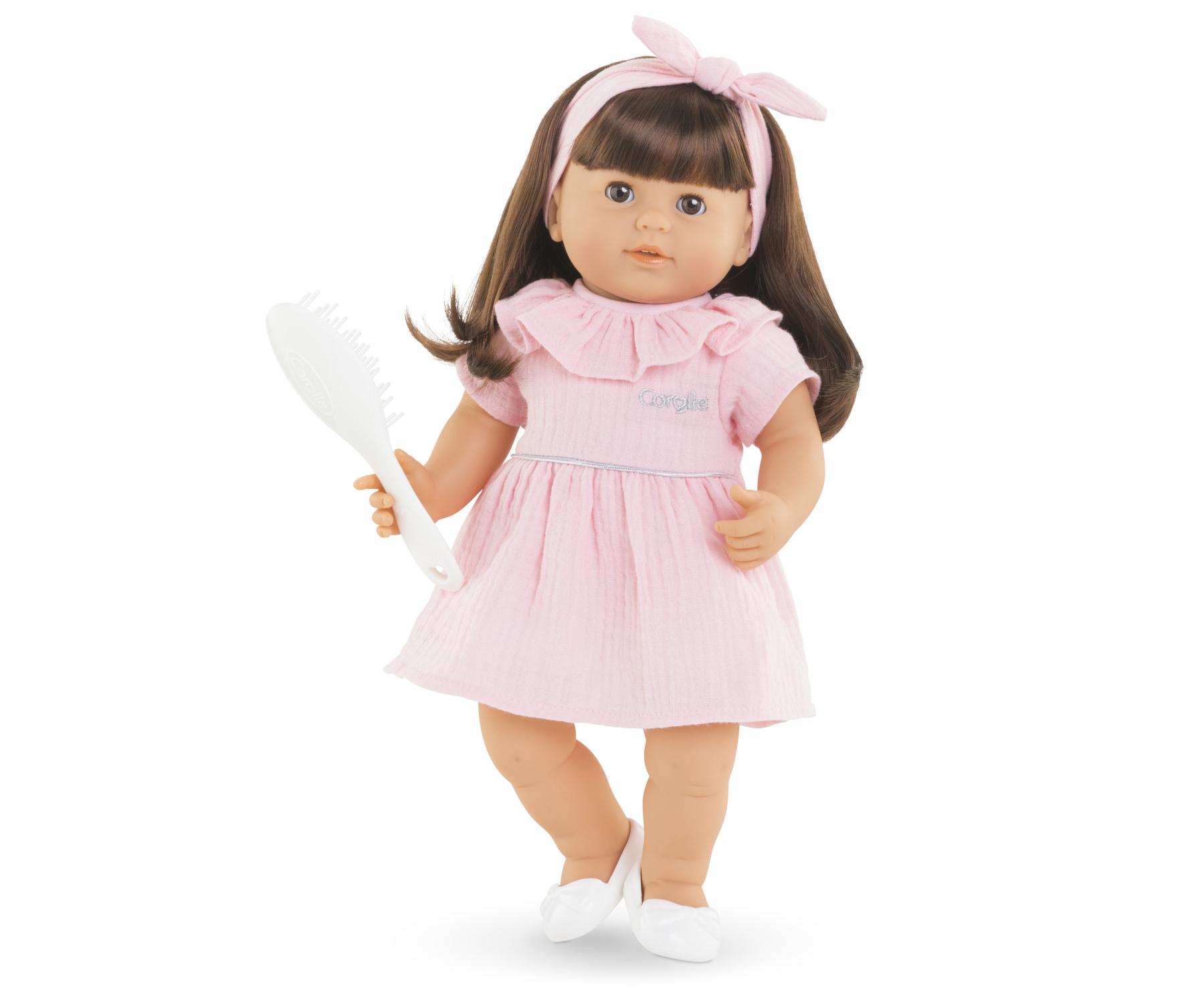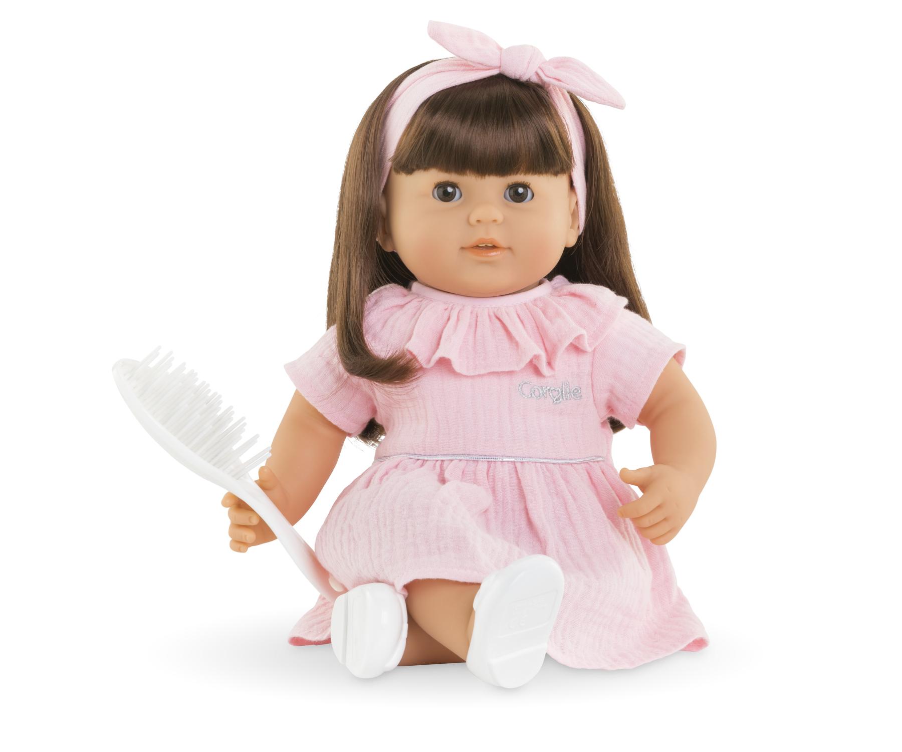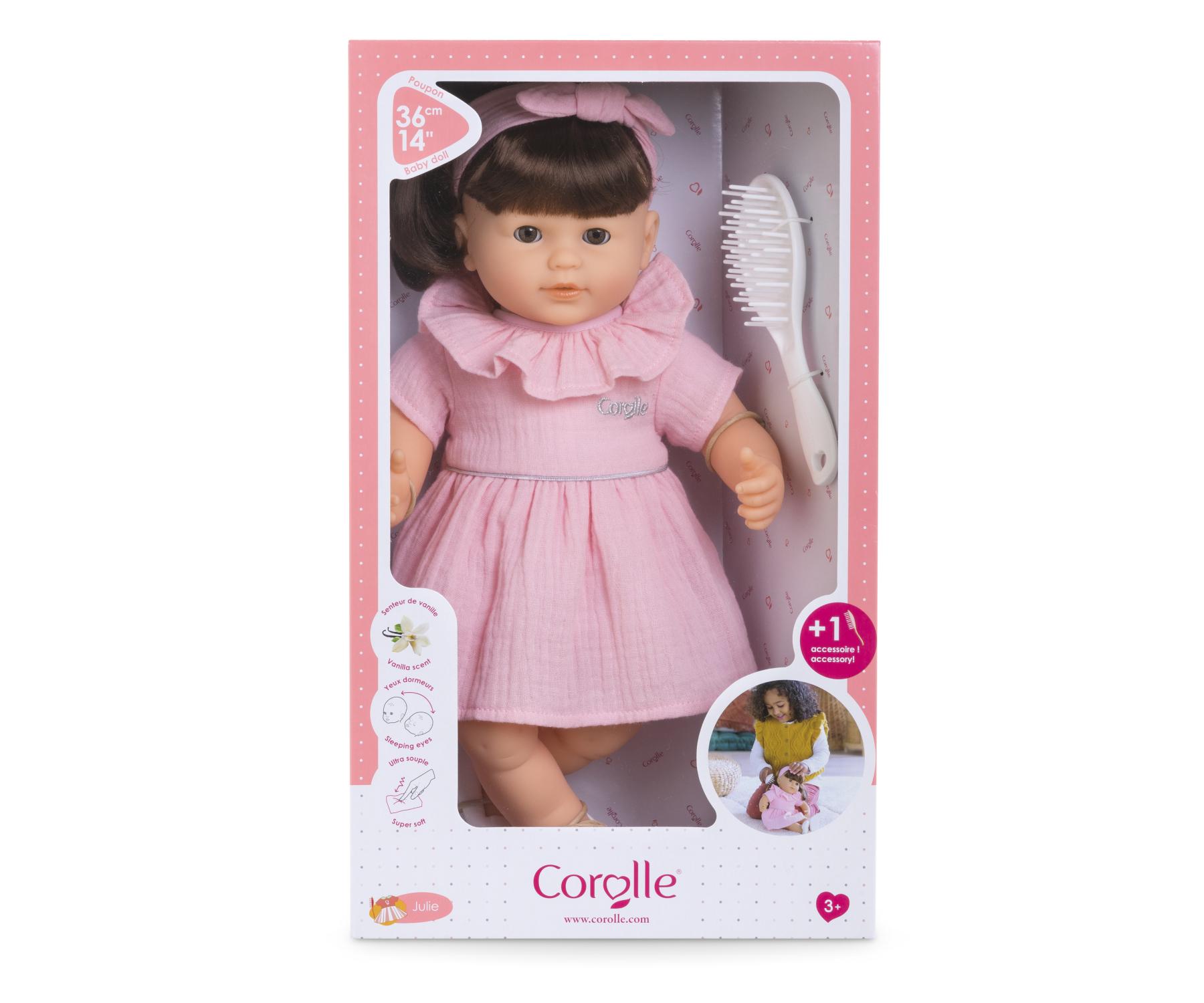 Julie is a 14-inch, soft-bodied mon grand poupon Corolle baby doll for little ones wanting a baby of their own to love. With her long easy-to-style hair, children ages 3 and up are introduced to hairstyling play (hairbrush included). Julie has brown sleepy eyes that close when she is put down for a nap or at bedtime, and her head and limbs are made of soft, supple vinyl that is lightly scented with vanilla, a Corolle signature. She is dressed in a pretty pink dress and wears a color-coordinated headband and removable white shoes.