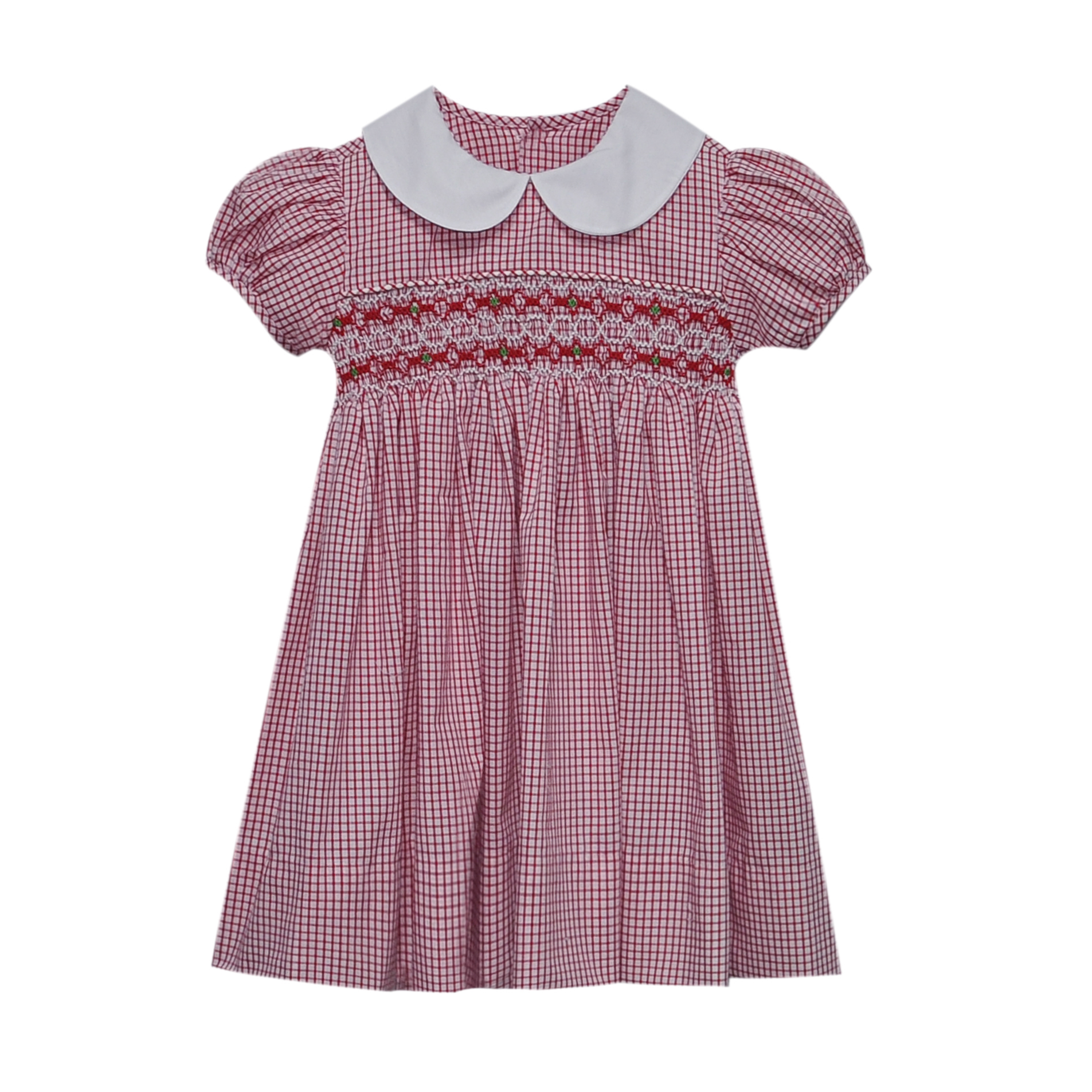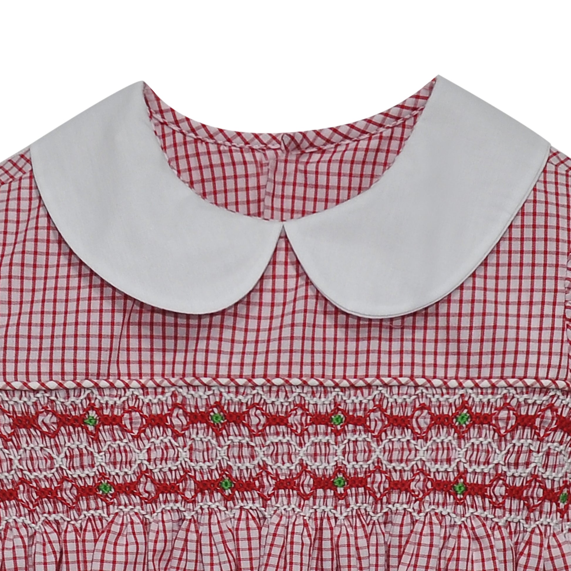 Every stitch tells a story in this classic red and white dress from Remember Nguyen. With delicate smocking, dainty embroidered flowers, and a crisp Peter Pan collar, this piece blends heirloom elegance with playful charm. Puff sleeves add just the right touch of sweetness, while the gathered skirt offers room for twirls and tea parties galore.