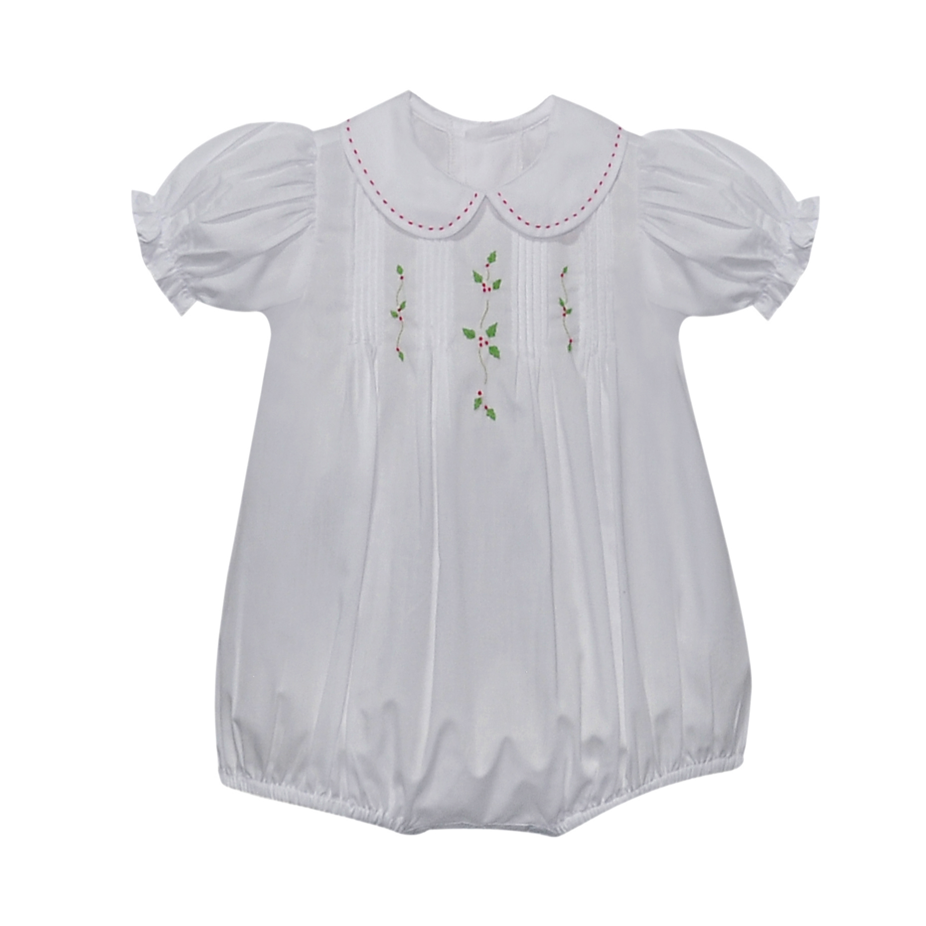 Wrap your little one in seasonal sweetness with this Baby Sen bubble, where delicate red hollies pop like berries against a snow-white base. The puffed sleeves and classic Peter Pan collar—edged in red—add a hint of gentleness, while the front embroidery brings cheerful tidings with sprigs of red and green. With comfy elastic legs and timeless charm, it’s made for giggles under garlands and cuddles by the cocoa bar.