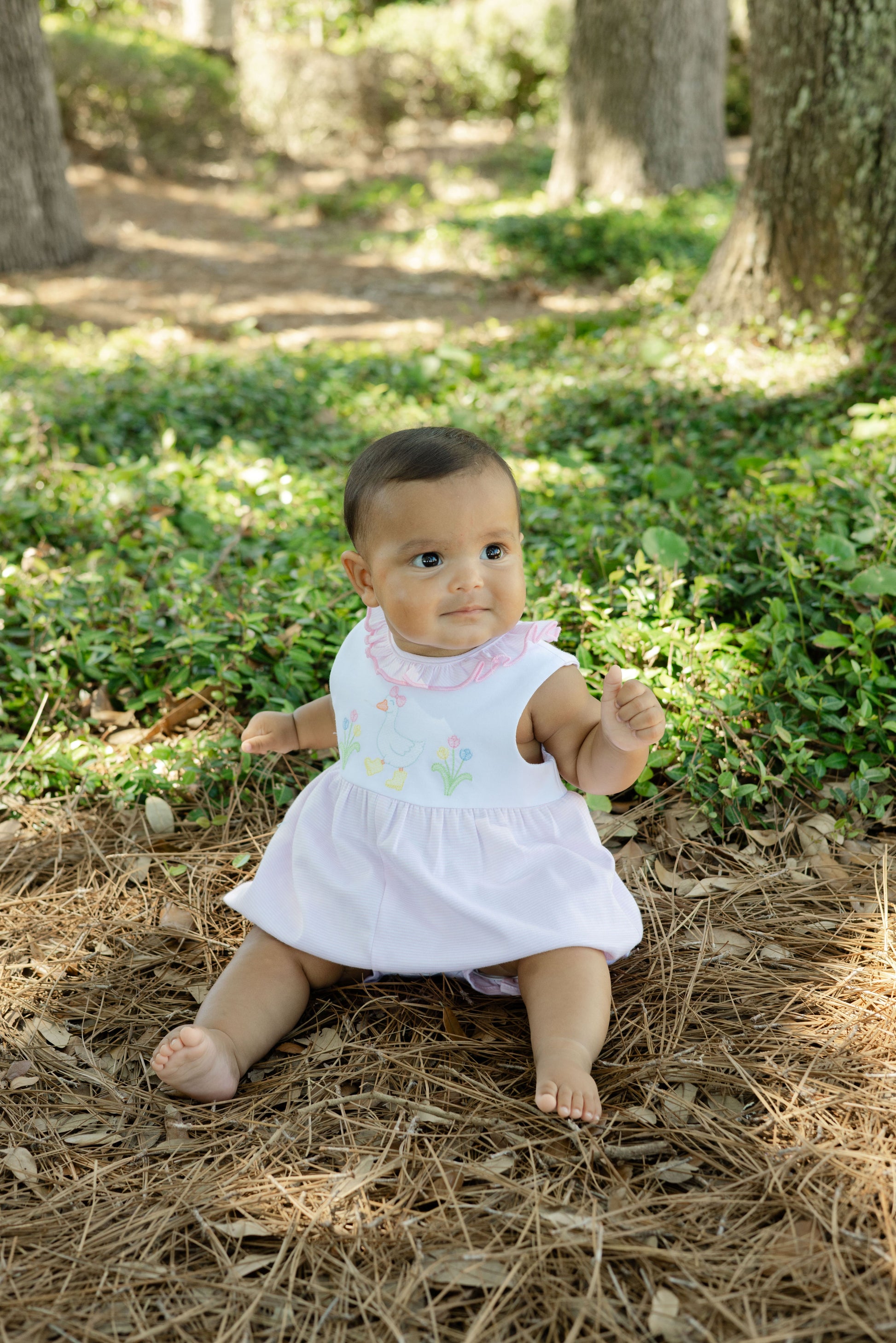 This Goose in Boots romper combines cozy knit fabric with lighthearted embroidery. The charming geese in their tiny boots make it an instant favorite for spring events. Designed for comfort and easy dressing, it’s perfect for playdates, Easter brunch, or photo sessions.