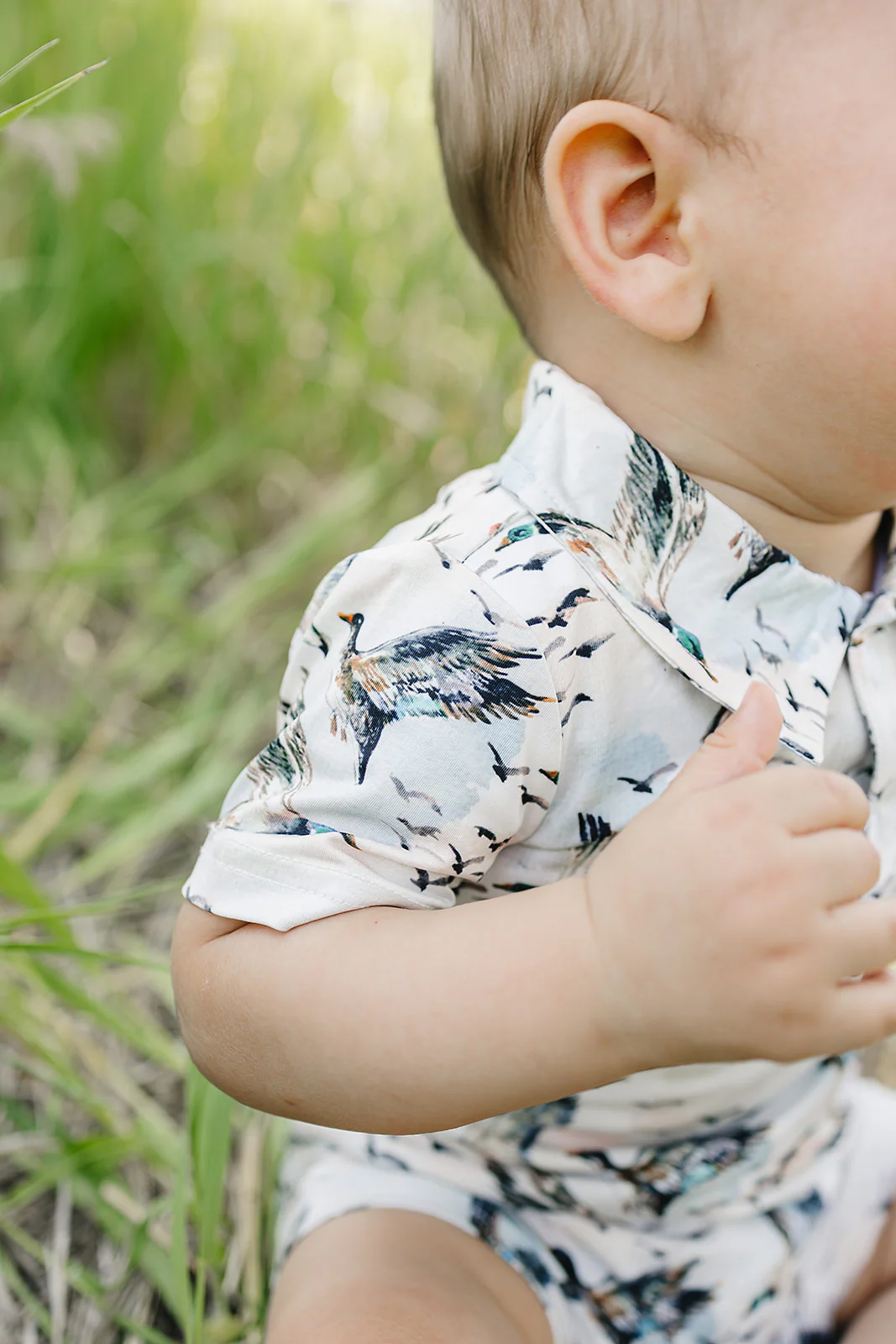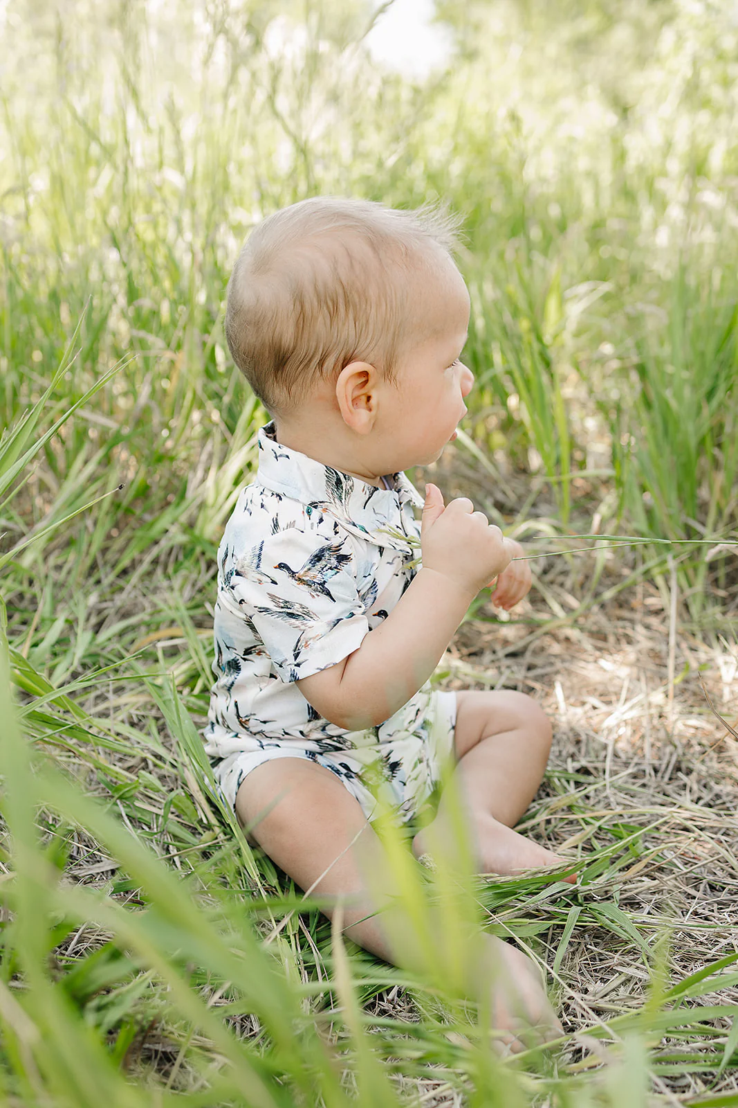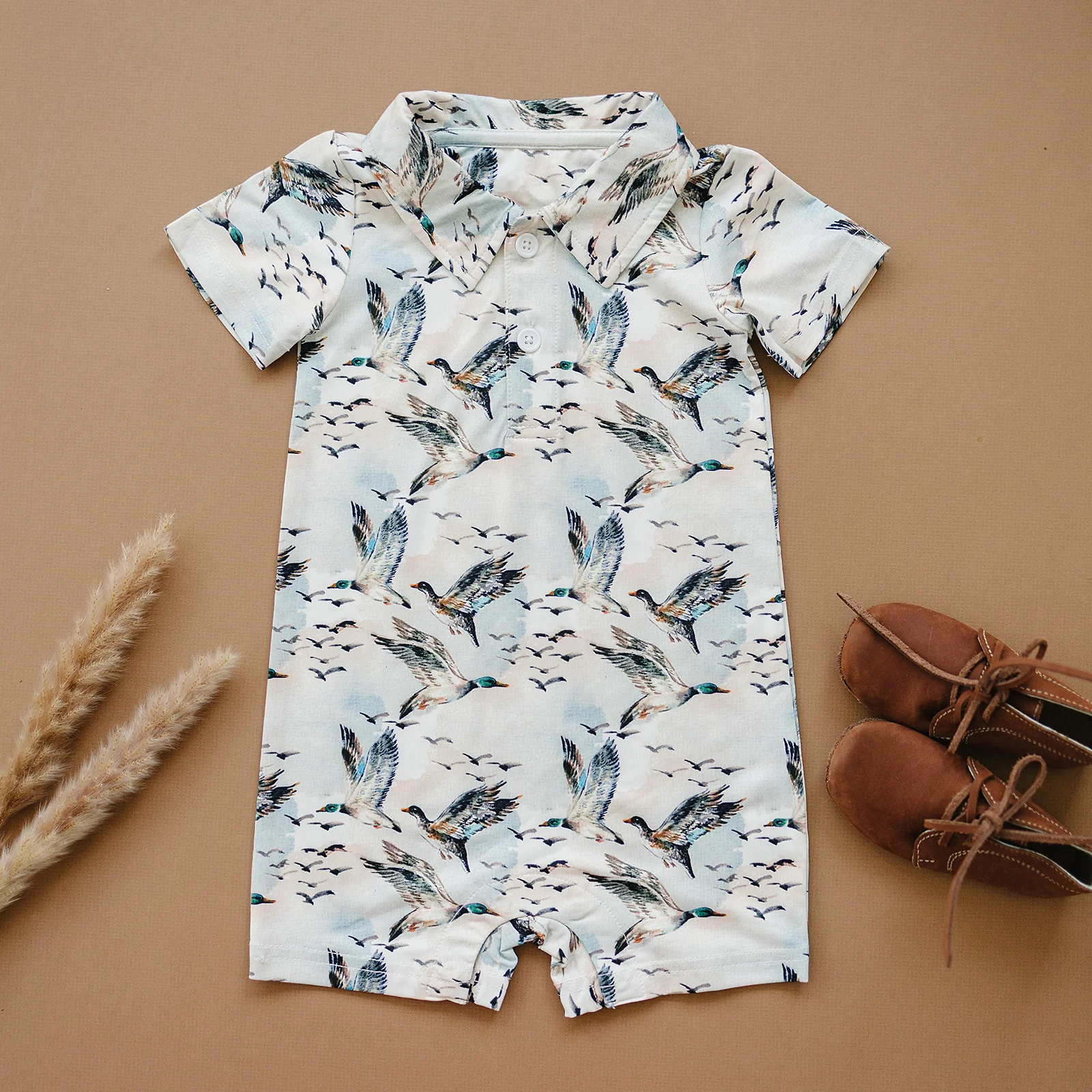 Made for sunshine and southern adventures, this baby boy jumper is crafted from lightweight, breathable, and packed with UPF 50+ sun protection. Featuring their 'mallard sky' all over mallard print, this short sleeve one piece keeps your little guy cool, covered and comfortable from backyard hangs to boat days.
