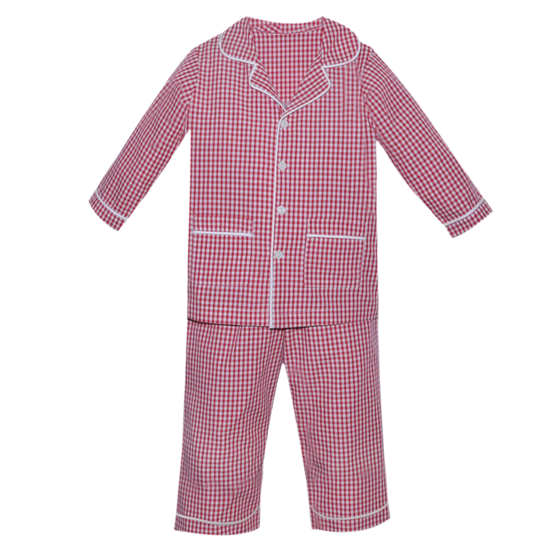 Tuck them in with tradition in this charming pajama set from Remember Nguyen, where red gingham meets vintage elegance. With crisp white piping, a button-down top, and tailored pockets, this look evokes memories of yesteryear — perfect for cocoa sipping, carol singing, and waiting for Santa’s sleigh.