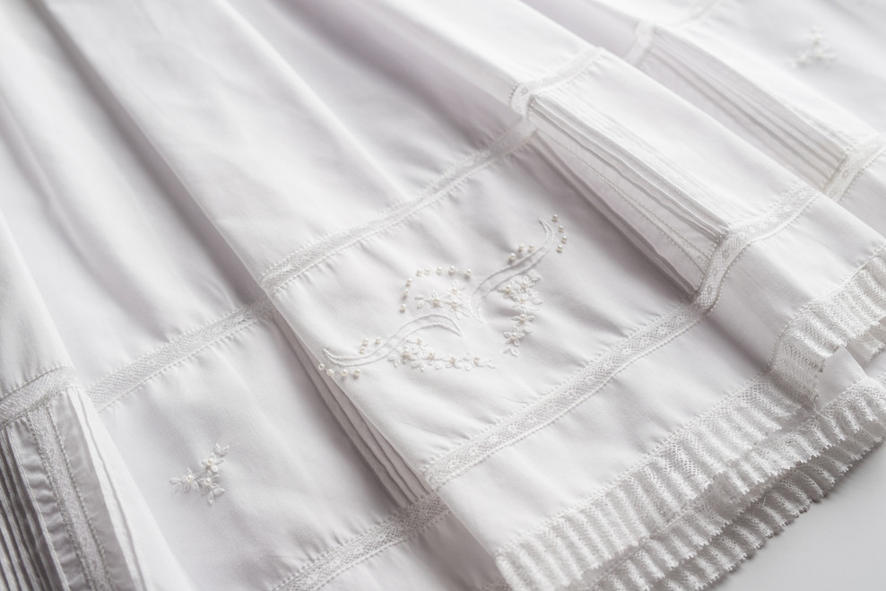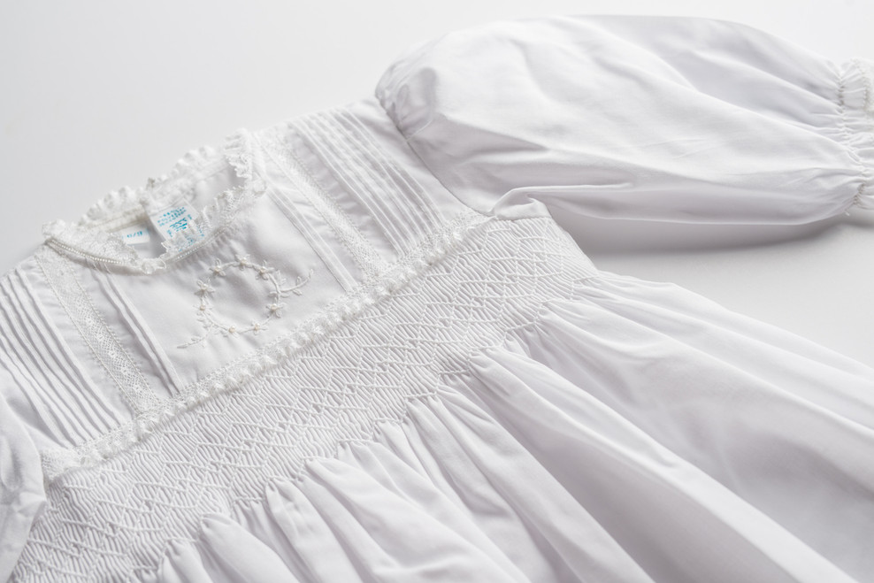 Looking for that perfect, exquisite special occasion gown for your little girl? Meet the Pearl Embroidery Special Occasion Set from Feltman Brothers. This little girls special occasion set is intricate, elegant, and classy - sure to make your little one shine on her special day. Fluted lace borders the neck, cuffs, hem and smocking of this gown. The top of the bodice has vertical pintucks with a beautiful lace insert and an intricate floral wreath embroidery with tiny dainty pearls - all hand done! Below that is a gorgeous smocking design with argyle embroidery which goes into sweet gathered pleats. The bottom of this dress is a masterpiece in itself - edged in a lovely lace insert on top and bottom, the end of this dress is designed to match the bodice with its vertical pintucks and lace. Check out the exquisite hand embroidery and pearls all over the bottom of this gown, giving it a nostalgic heirloom look. The slip dress beneath the gown has scalloped stitching around the neck and arms, and fluted lace in a scalloped design all along the hem. The slip dress features the same floral wreath embroidery this dress is known for. This set includes a hat with matching embroidered flowers and pearls, and a fluted lace edging. Sure to capture your eye and heart!