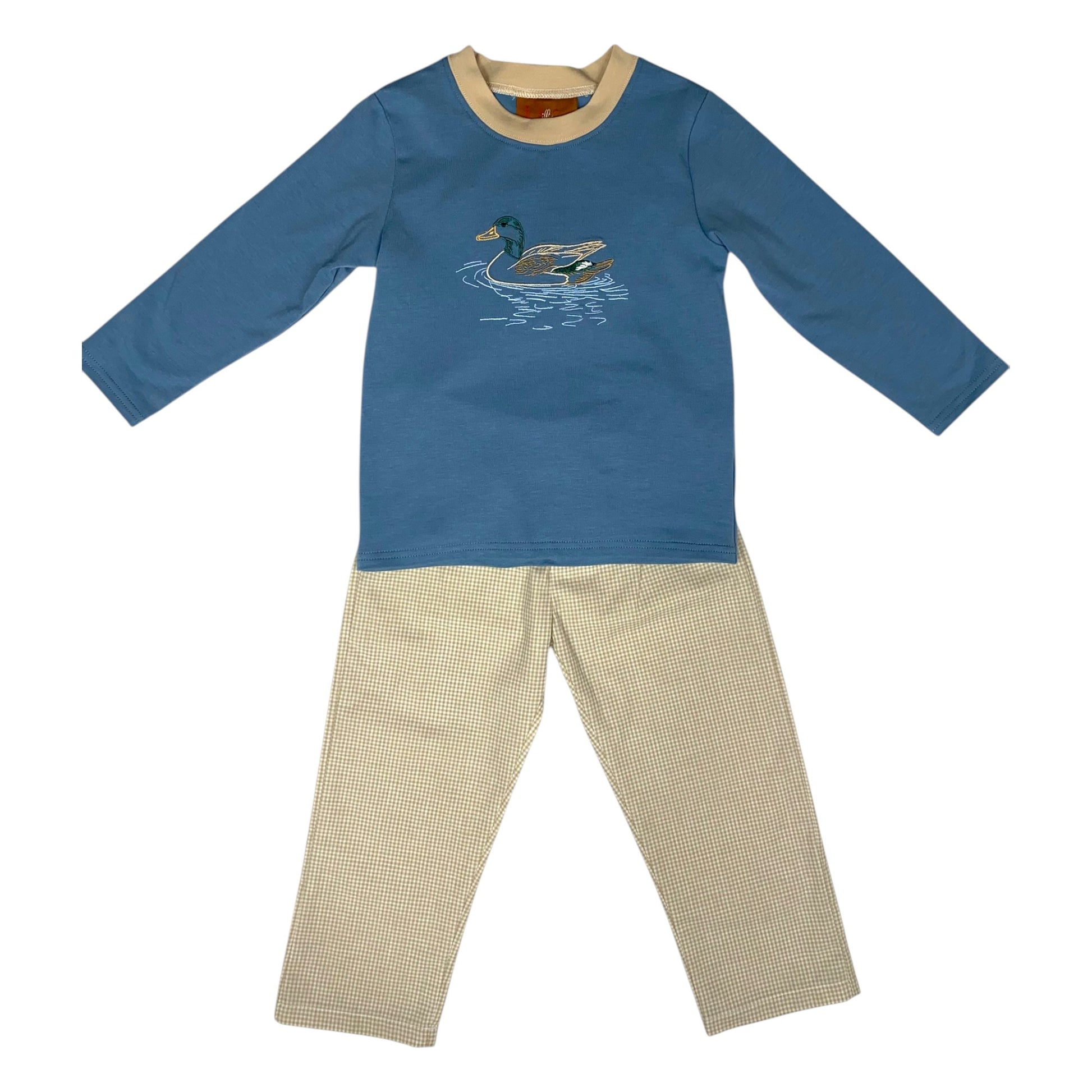 The Mallard Duck Boys Pant Set from Millie Jay blends classic charm with outdoor spirit. Featuring a blue long-sleeve top with a detailed duck embroidery and coordinating checkered pants, it’s a timeless look for crisp fall days and family outings.