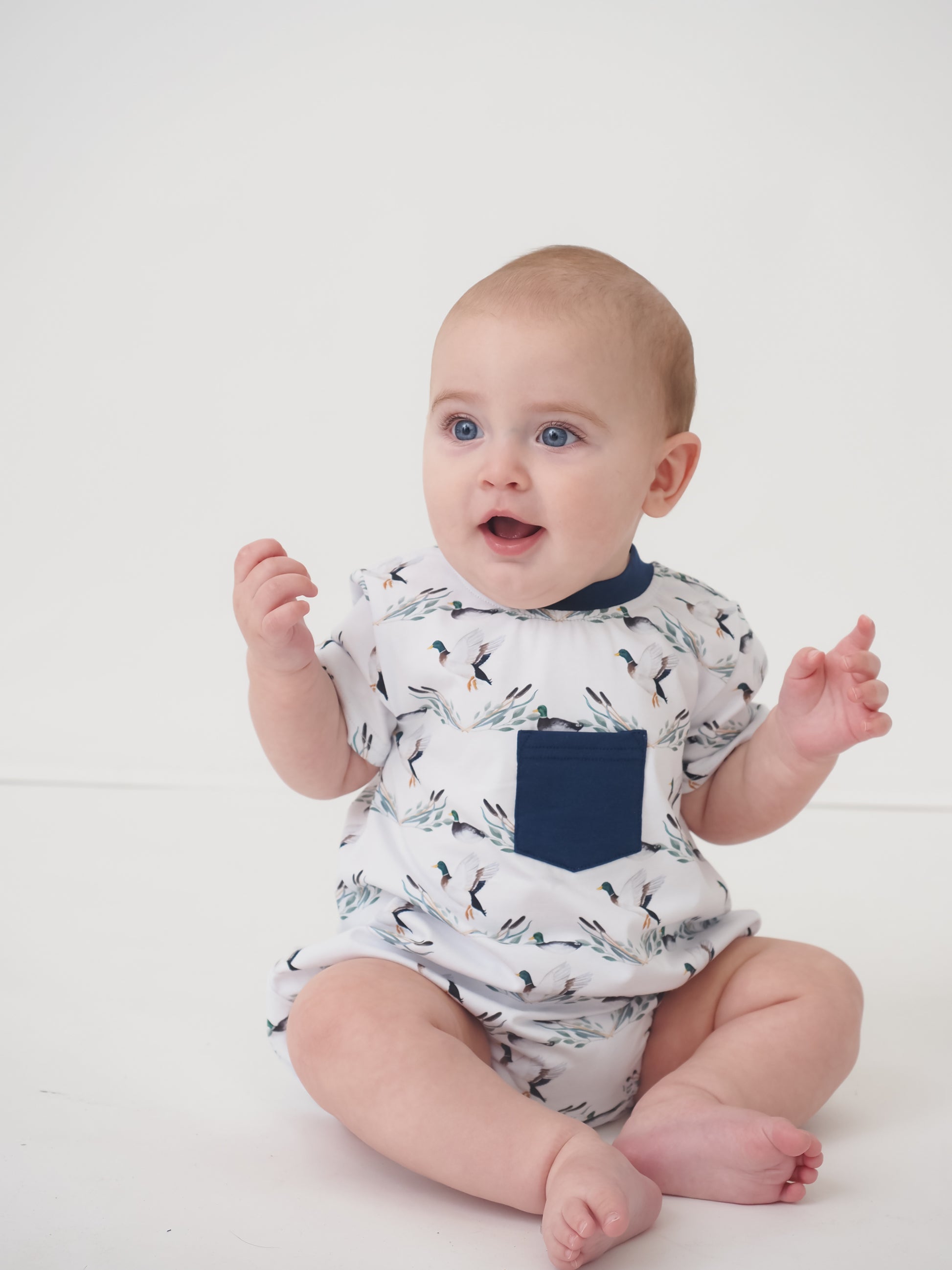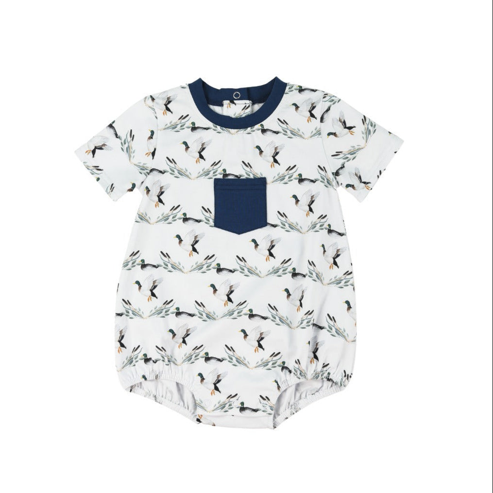 A dapper nod to nature’s quiet charm, the Mannered Mallards Bradley Bubble is a storybook staple for little explorers. Cypress Row brings woodland whimsy to life with a crisp white backdrop adorned in painterly mallards and leafy branches. The navy trim and chest pocket add a tailored touch, while elastic leg openings and soft fabric keep comfort front and center. Whether he's toddling through tall grass or posing for fall portraits, this bubble blends classic style with a hint of adventure.
