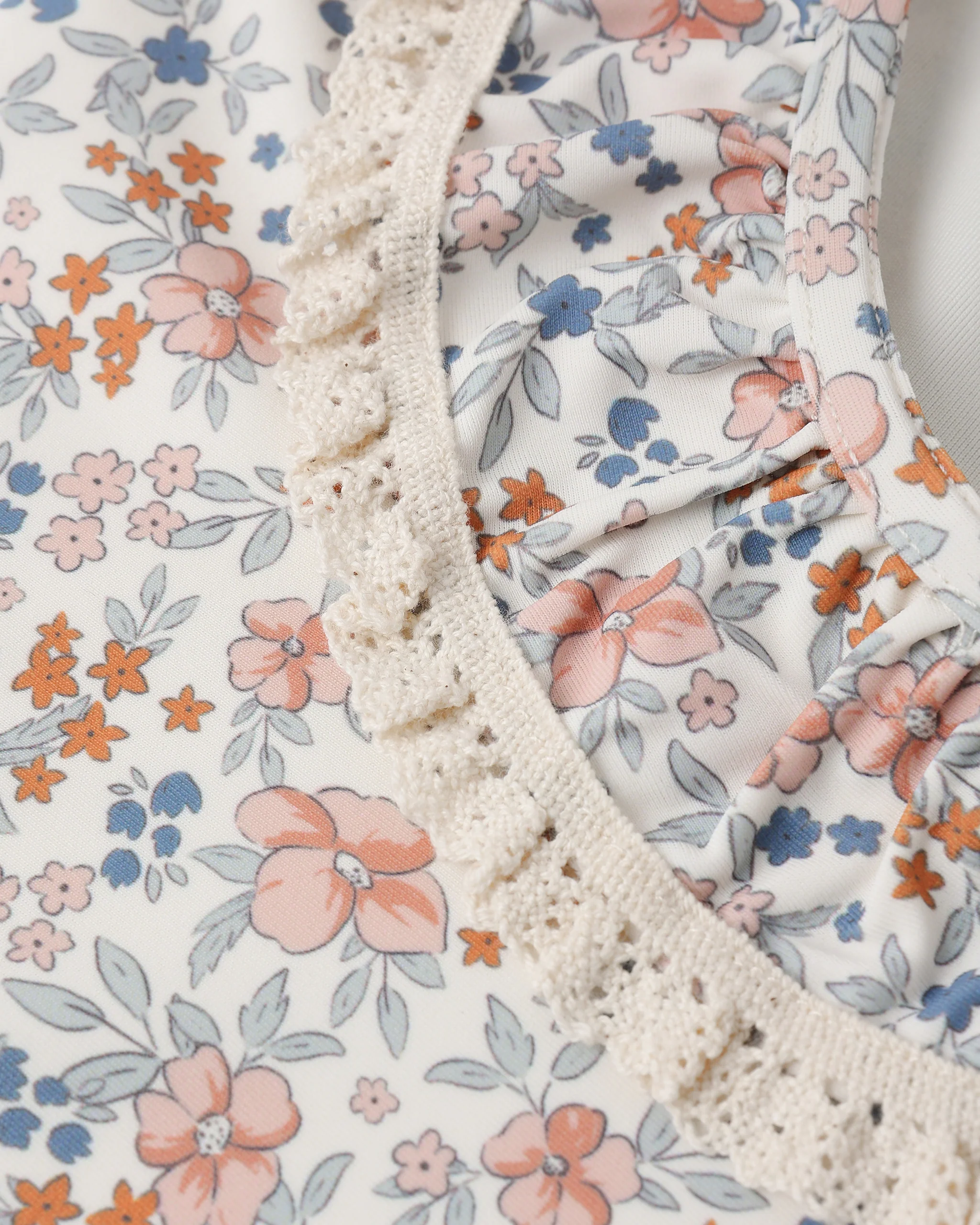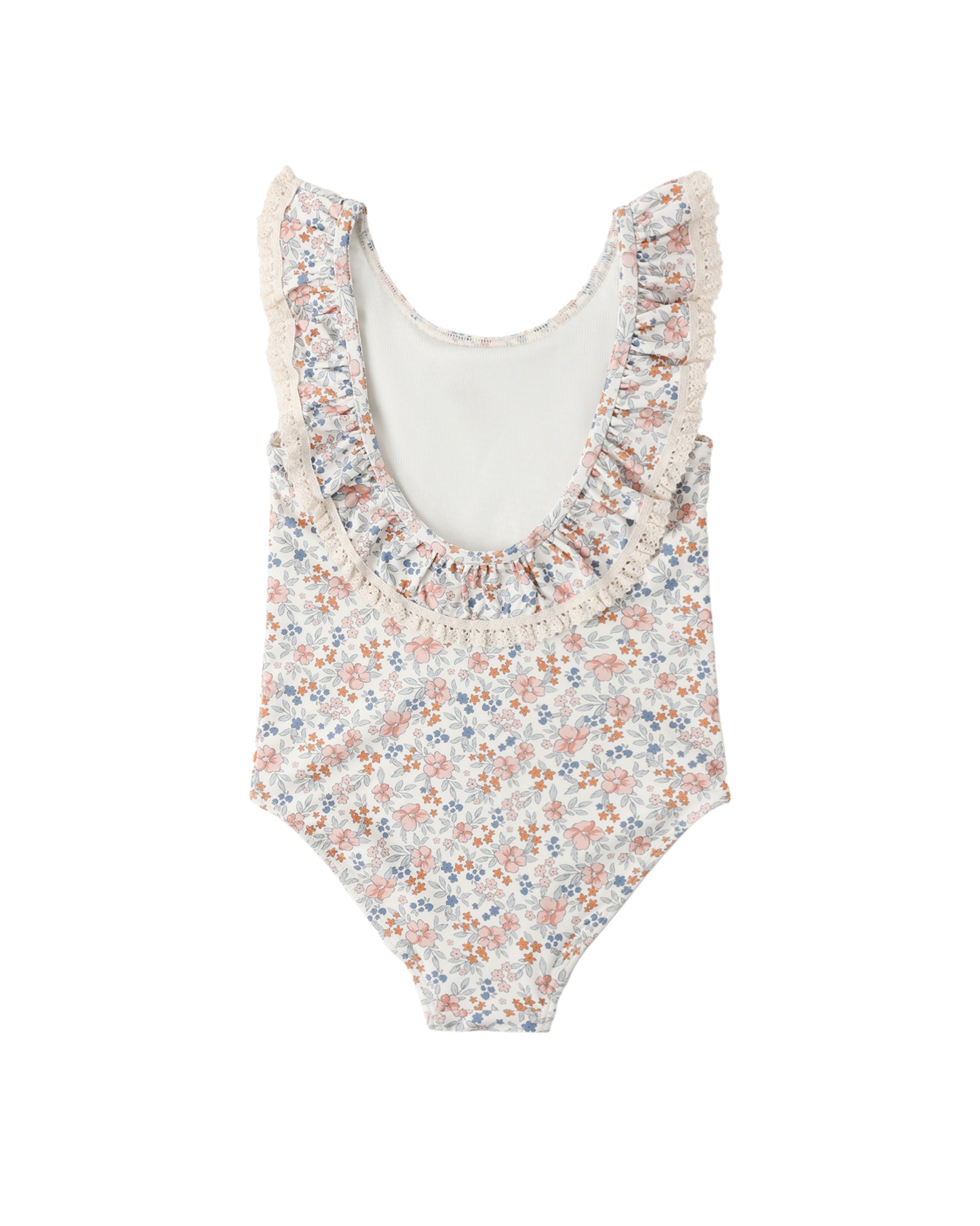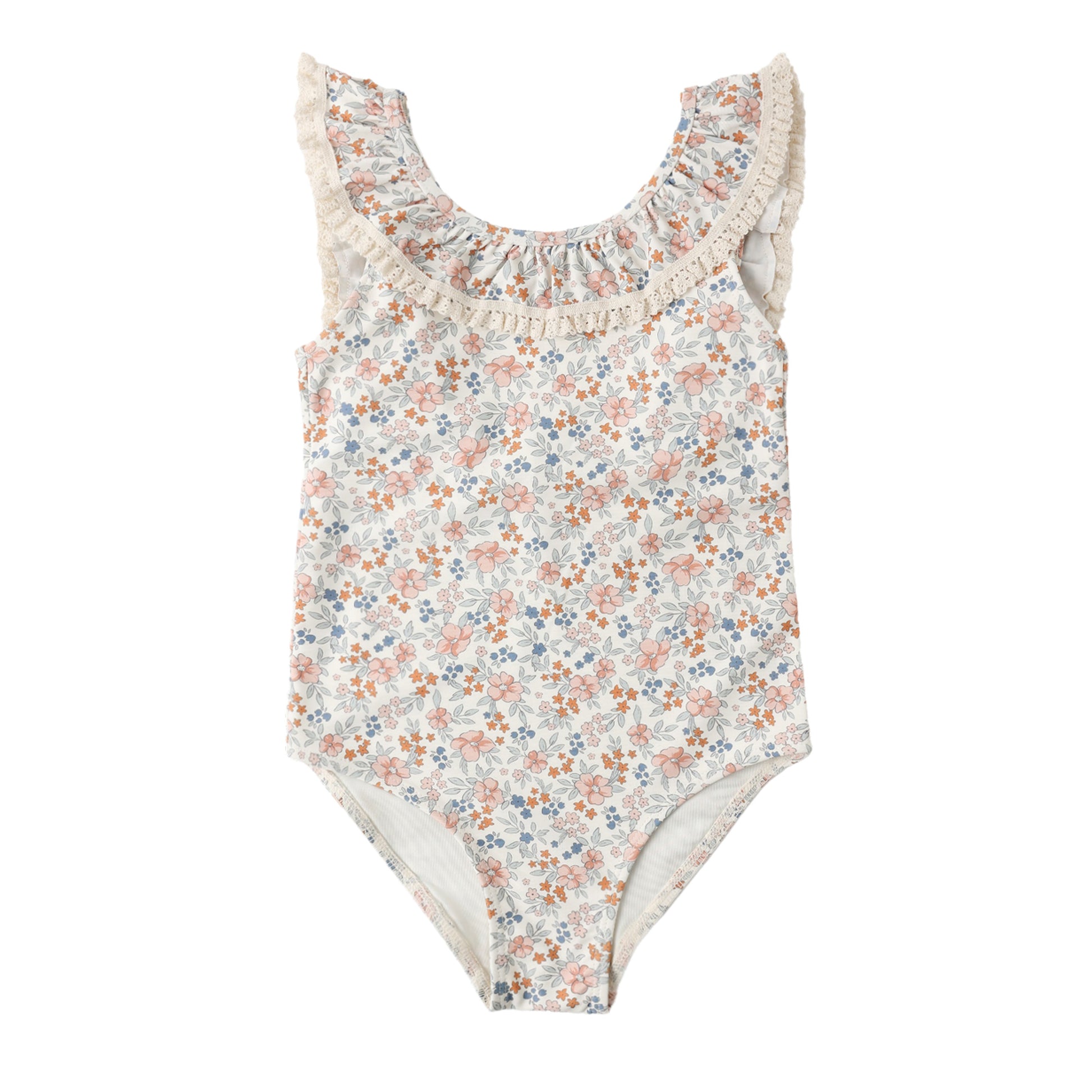 The Margaret One-Piece features a darling ruffle collar with fine crochet detail, adding fancy flair to your swimwear.
