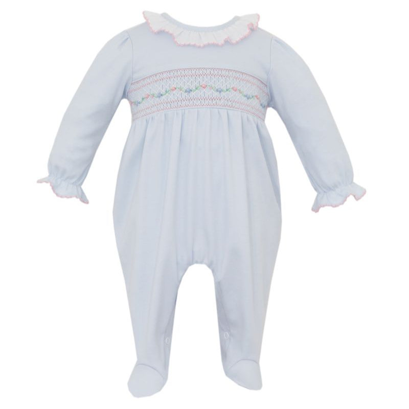 Wrap your little one in cozy elegance with this baby girl’s footie from Petit Bebe. Crafted in a soft powder blue knit, it features a hand-smocked chest panel embroidered in delicate pastels, adding a vintage-inspired touch. The ruffled collar and sleeve cuffs are trimmed in sweet pink stitching, giving the piece a gentle pop of color and extra charm. With covered feet for warmth and back snaps for easy changes, it’s the perfect blend of comfort and classic style. Ideal for naptime, playtime, or snuggly photo ops—this footie is as precious as she is. 💙🌸