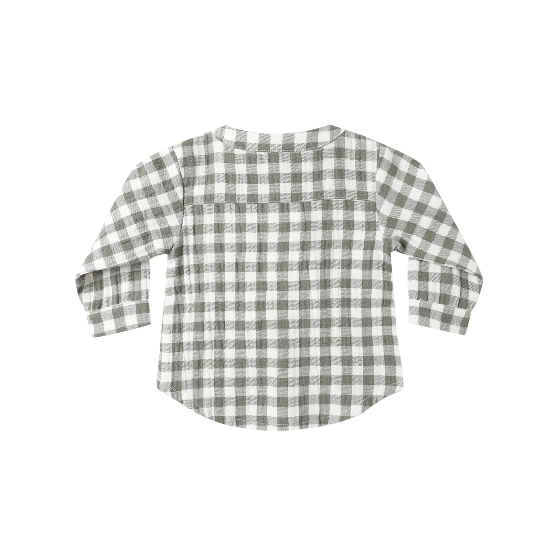 Quincy Mae's Long Sleeve Milo Shirt features a mandarin collar, chest pocket, and buttons along the front placket for a clean, modern look.