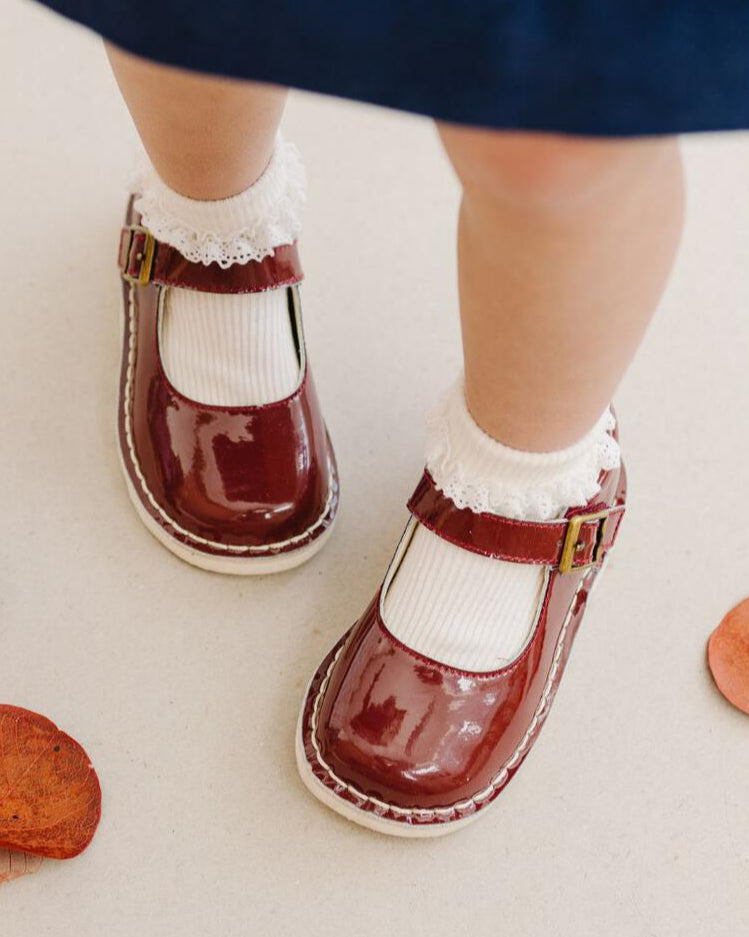 The Morgan is a not-so-basic school shoe with a pop of color that's rich, deep, and inspired by shades of plum. This style brings back the joy of nostalgic school days.