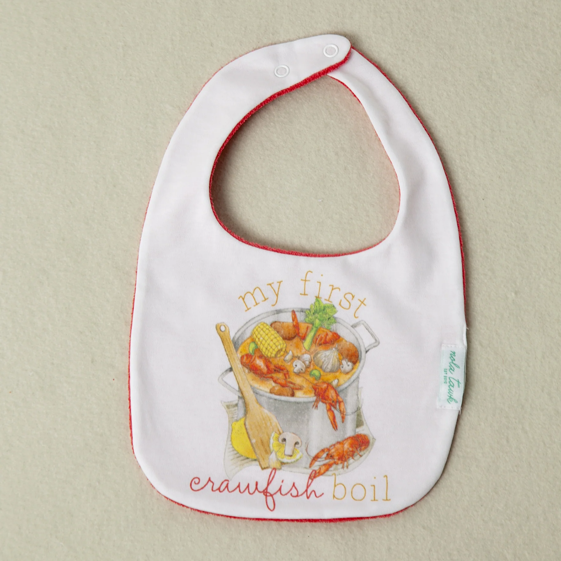 Nola tawk's 'My First Crawfish Boil' organic baby bibs are the perfect accessory for your baby to try their first savory New Orleans tradition!