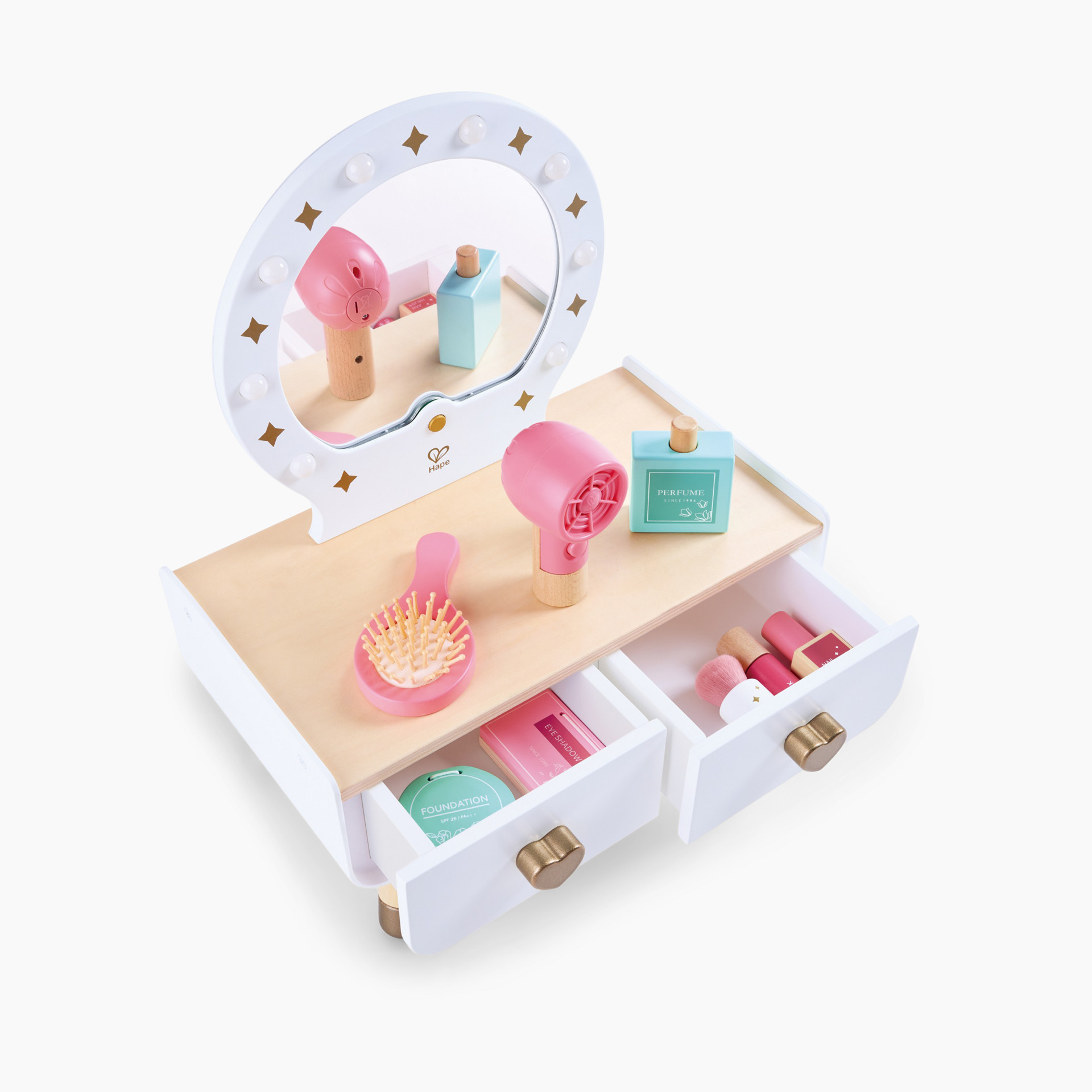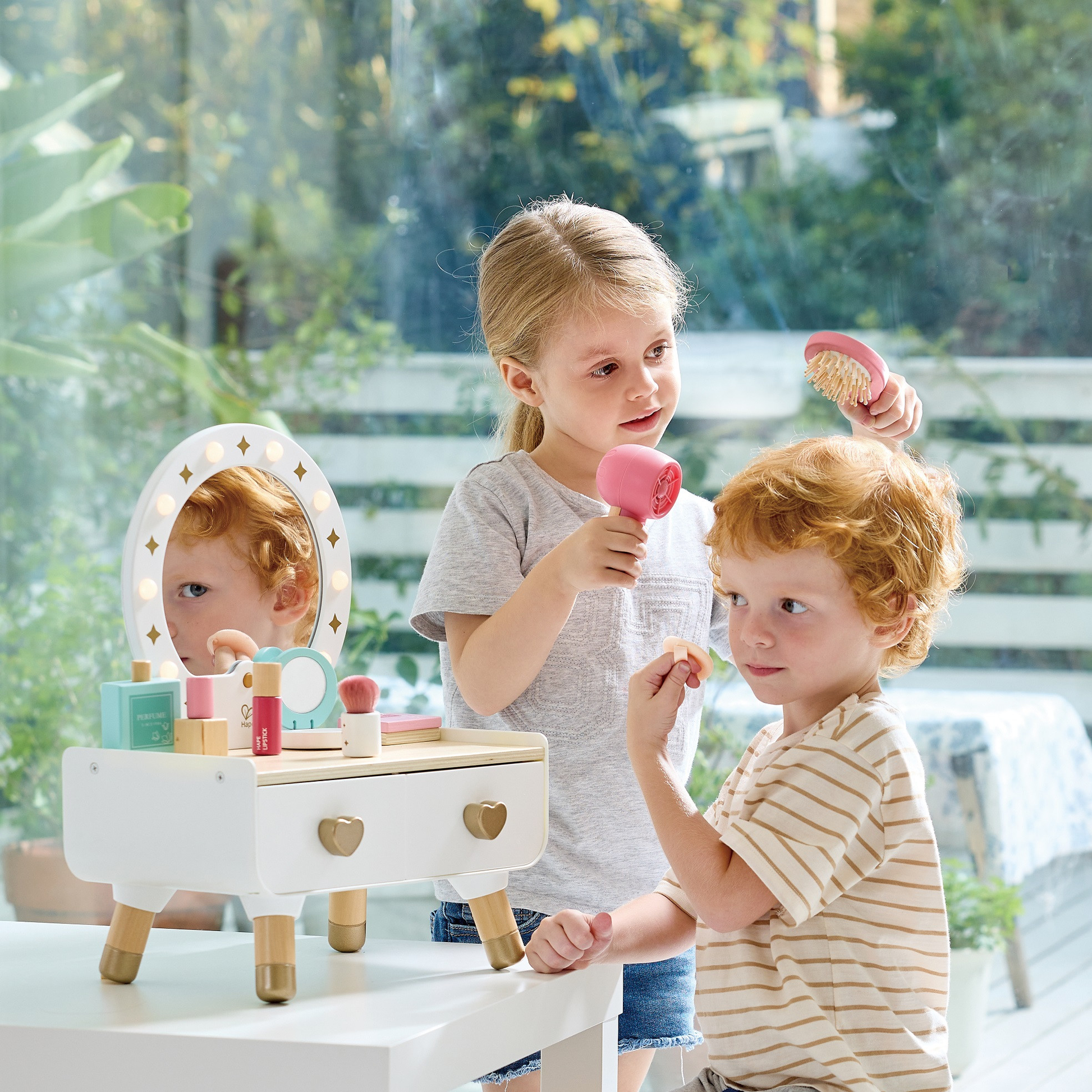- Interactive hair dryer: Simulates real functionality, complete with the sound of blowing wind so kids can safely experience the sensation of using a hair dryer