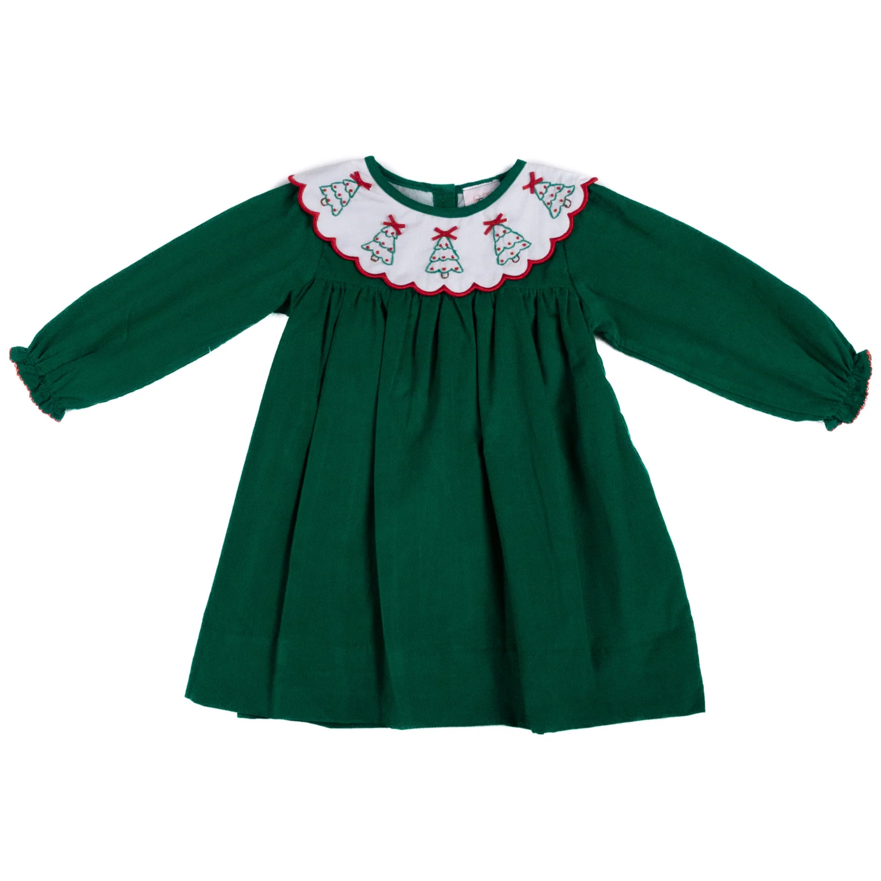This timeless holiday dress is crafted from rich green corduroy and finished with beautifully hand-embroidered Christmas trees. The scalloped white collar with red trim adds festive detail, while long sleeves with gathered cuffs complete the traditional look. Ideal for Christmas celebrations and seasonal portraits.