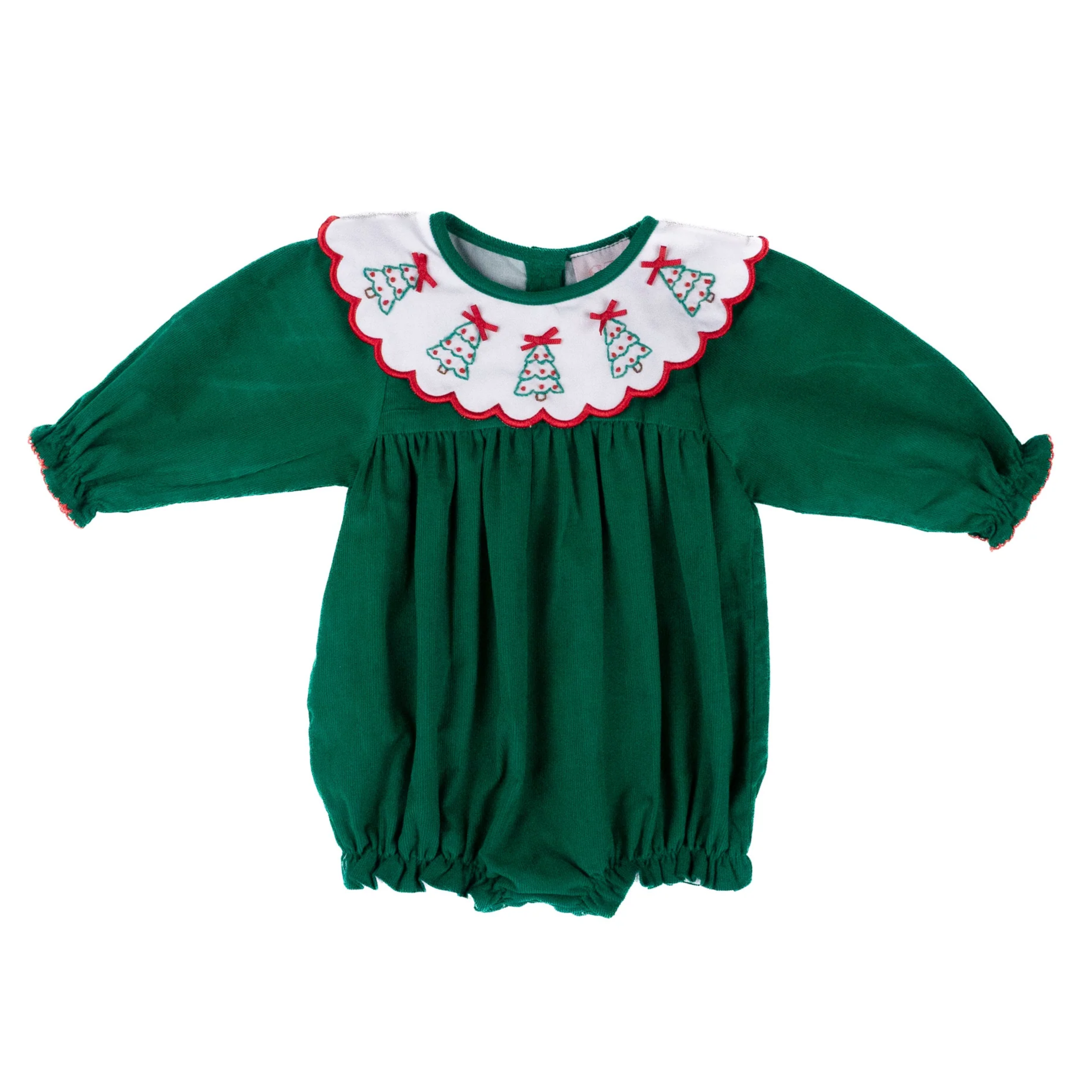 A holiday classic, this bubble is crafted from rich green corduroy and features a crisp white neckline with hand-embroidered Christmas trees. Long sleeves with red stitched trim and gathered leg openings add traditional charm while ensuring comfort. Perfect for Christmas photos, family gatherings, and festive celebrations, this heirloom-quality piece blends timeless style with seasonal spirit.