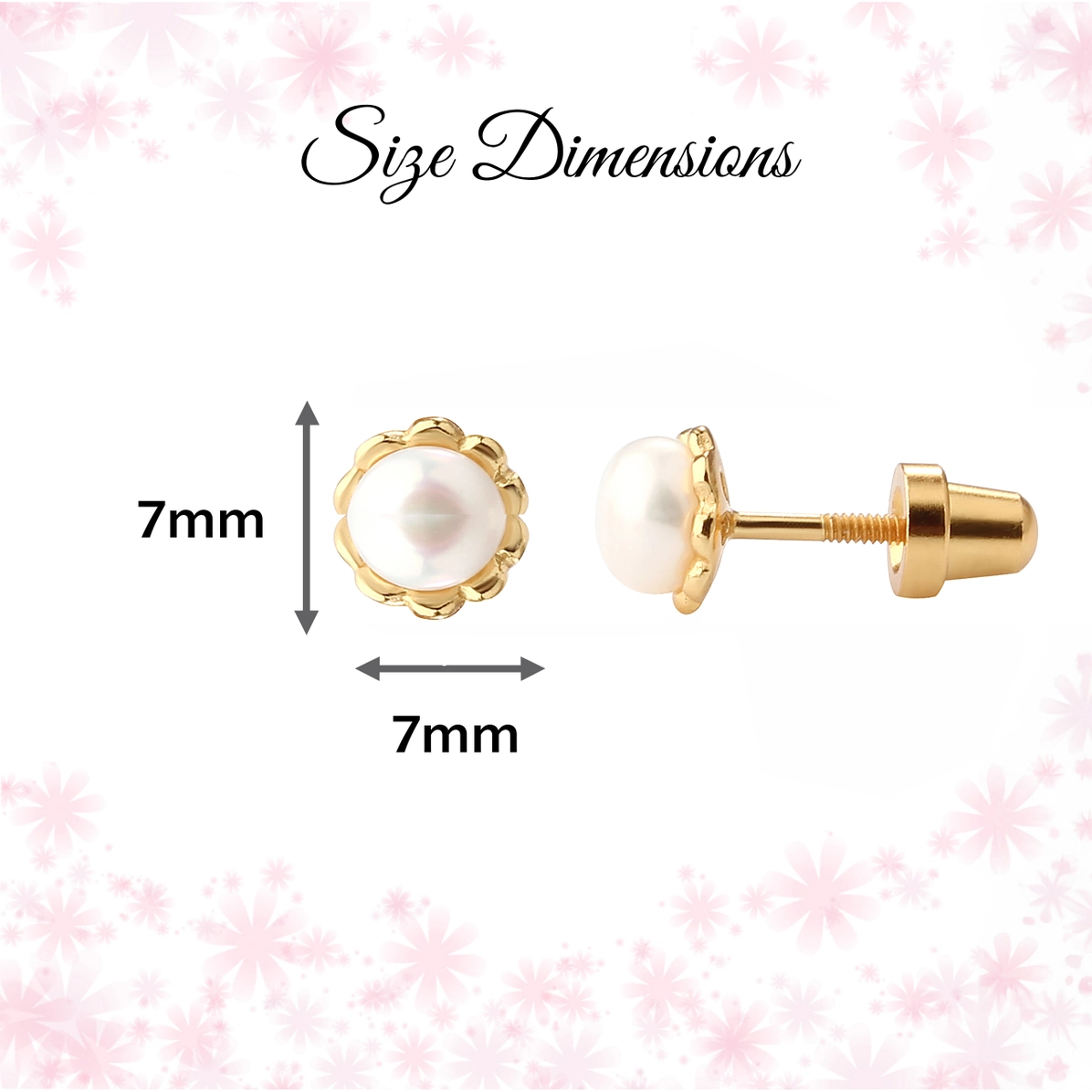 These delicate sterling silver earrings are the perfect accessory for your little one. Featuring a beautiful freshwater pearl at the center, each earring is surrounded by an elegant scalloped decorative border that adds a touch of charm. Designed with a secure screw-back closure, these earrings are ideal for babies, toddlers, and young girls, ensuring both safety and comfort.