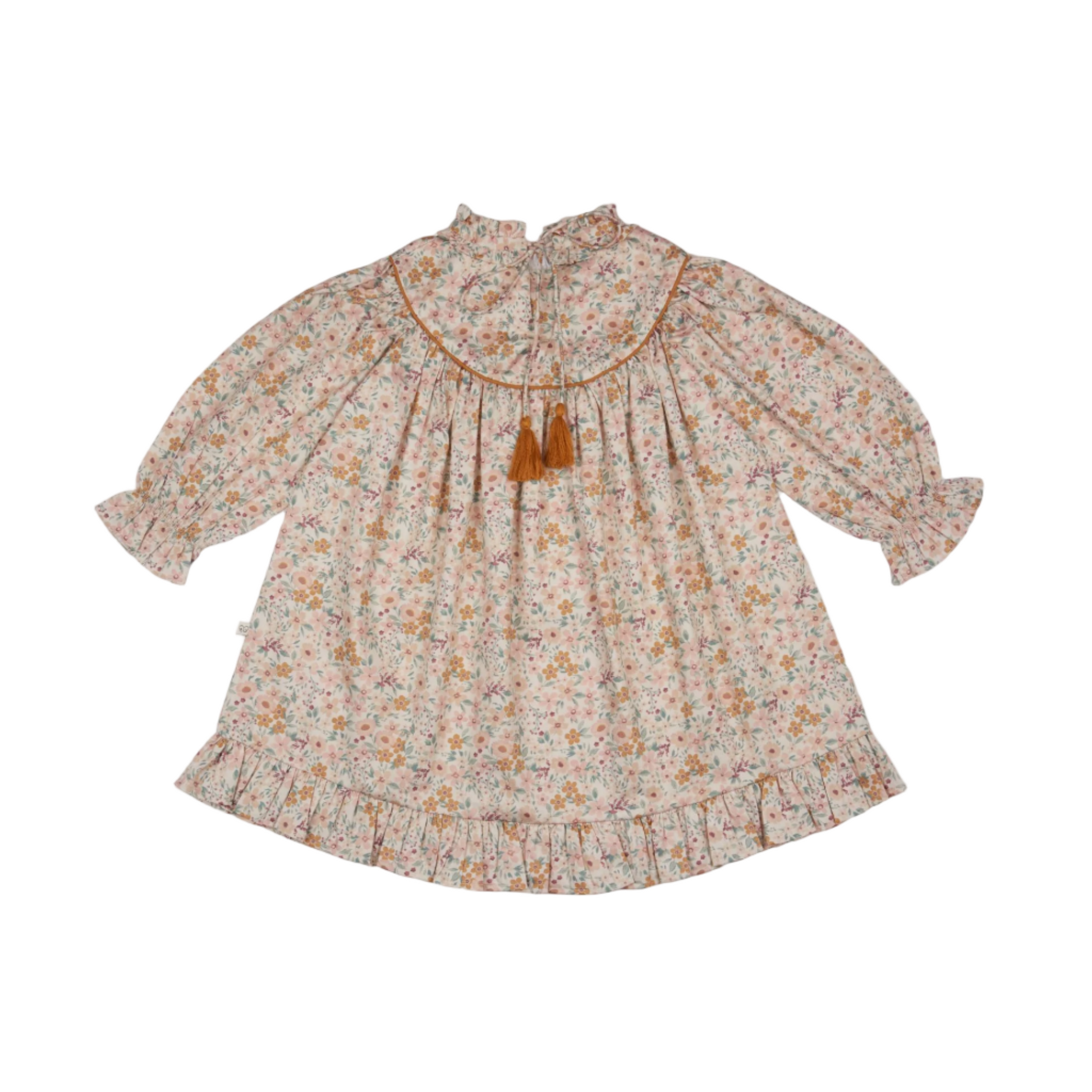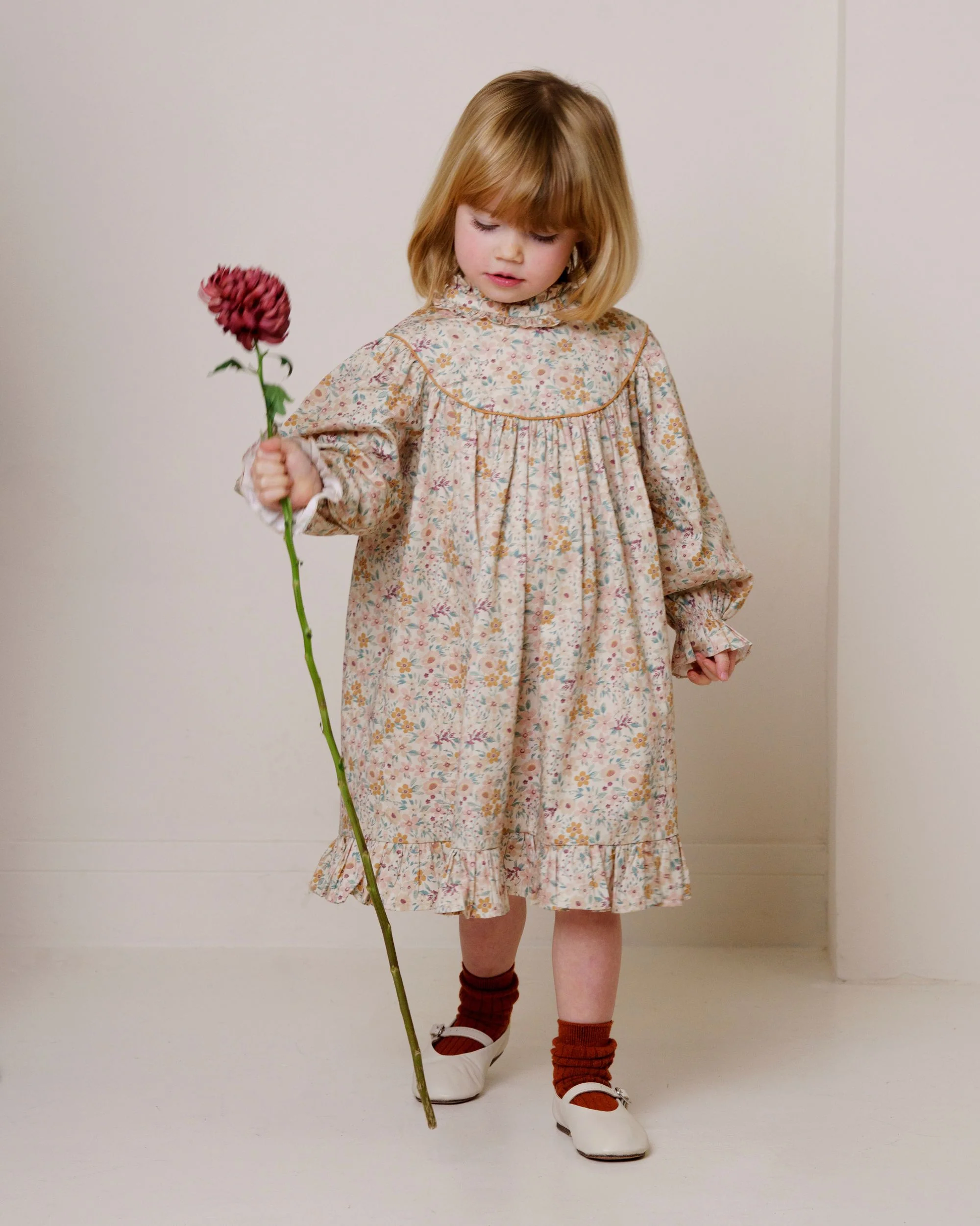 The Penelope Dress is a delightful celebration of childhood. Crafted in a beautifully soft cotton satin, the floral print blooms in warm, autumnal hues that feel both timeless and playful.