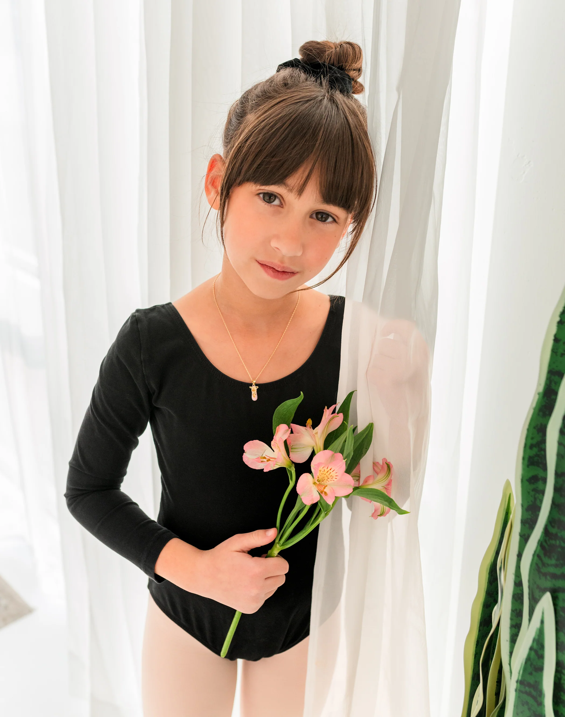 Adorable 14K gold-plated ballet slipper charm necklace accented in pink with a gold bow. Perfect gift for those girls who love to dance, ballerina dancers, and makes a great recital gift! Perfect gift for granddaughters, friend gift, birthdays, or dance friend gift.