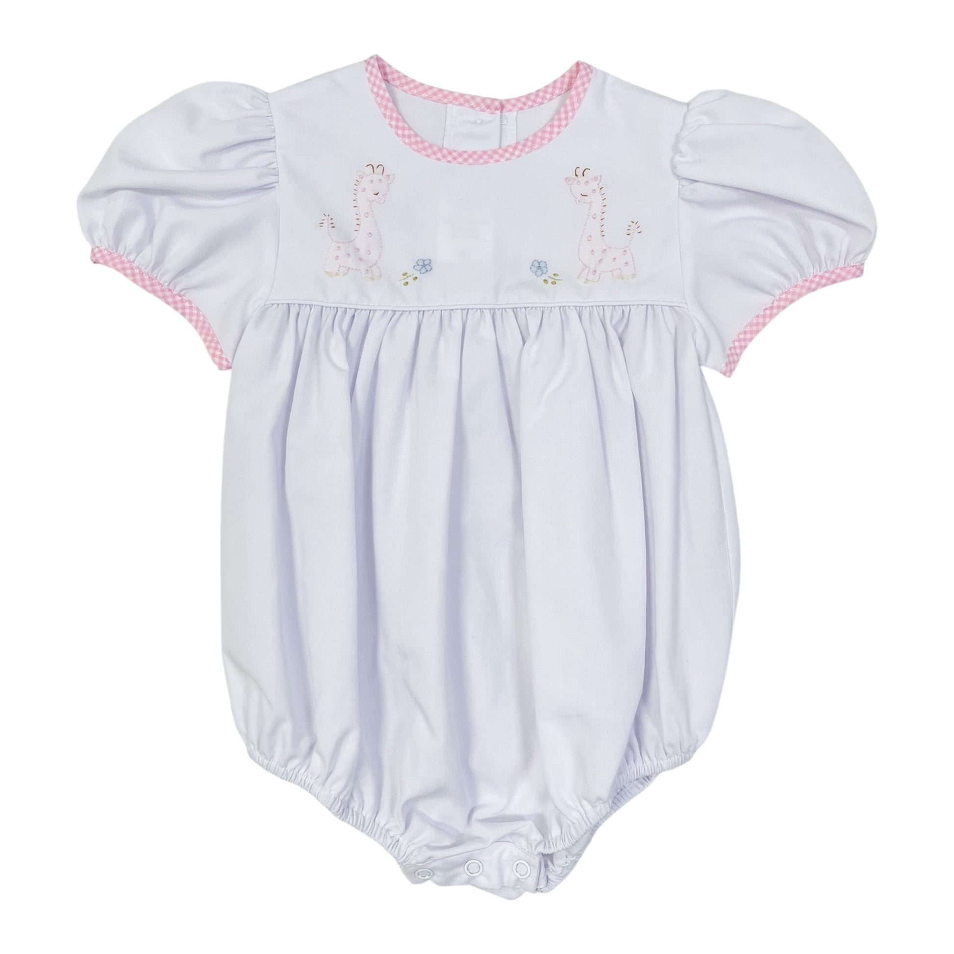 Get ready to cuddle your little one in this adorable Pink Check Giraffe Bubble! Made with love for baby girls, this white bubble boasts playful pink check trim and a cute pink embroidered giraffe design. Perfect for playtime or photo ops.