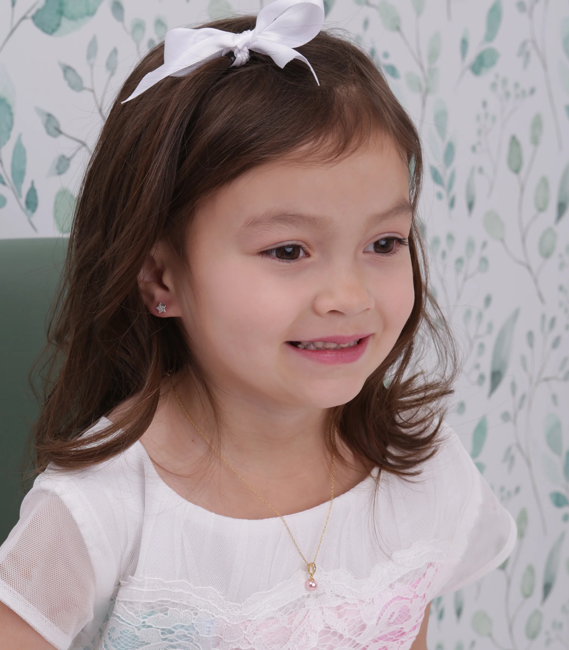 14K gold-plated (over sterling silver) traditional pink pearl pendant for children suspended on a 14" or 18" chain with high-quality clasp. Necklace features a high-end simulated pink pearl accented with sparkling CZ stones. Makes a classic timeless gift she will love and be a keepsake she will cherish forever! Coordinating bracelet and earrings available as well. What a special keepsake gift for toddlers, little girls and children!