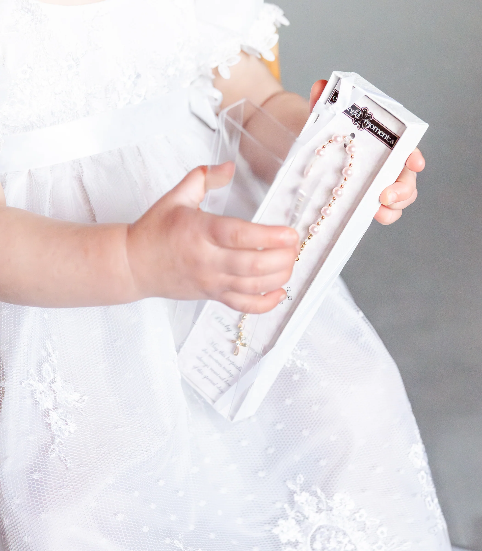This precious baby rosary baptism gift makes a special baptism keepsake designed with 14k gold-plating over sterling silver and designed with exquisite high-end Austrian simulated pink pearls and crystals. This Pink Baby Rosary Baptism Gift features a miraculous medal and cross charm and is packaged as a special keepsake ready for gifting. Celebrate these cherished moments with this keepsake she will treasure forever!