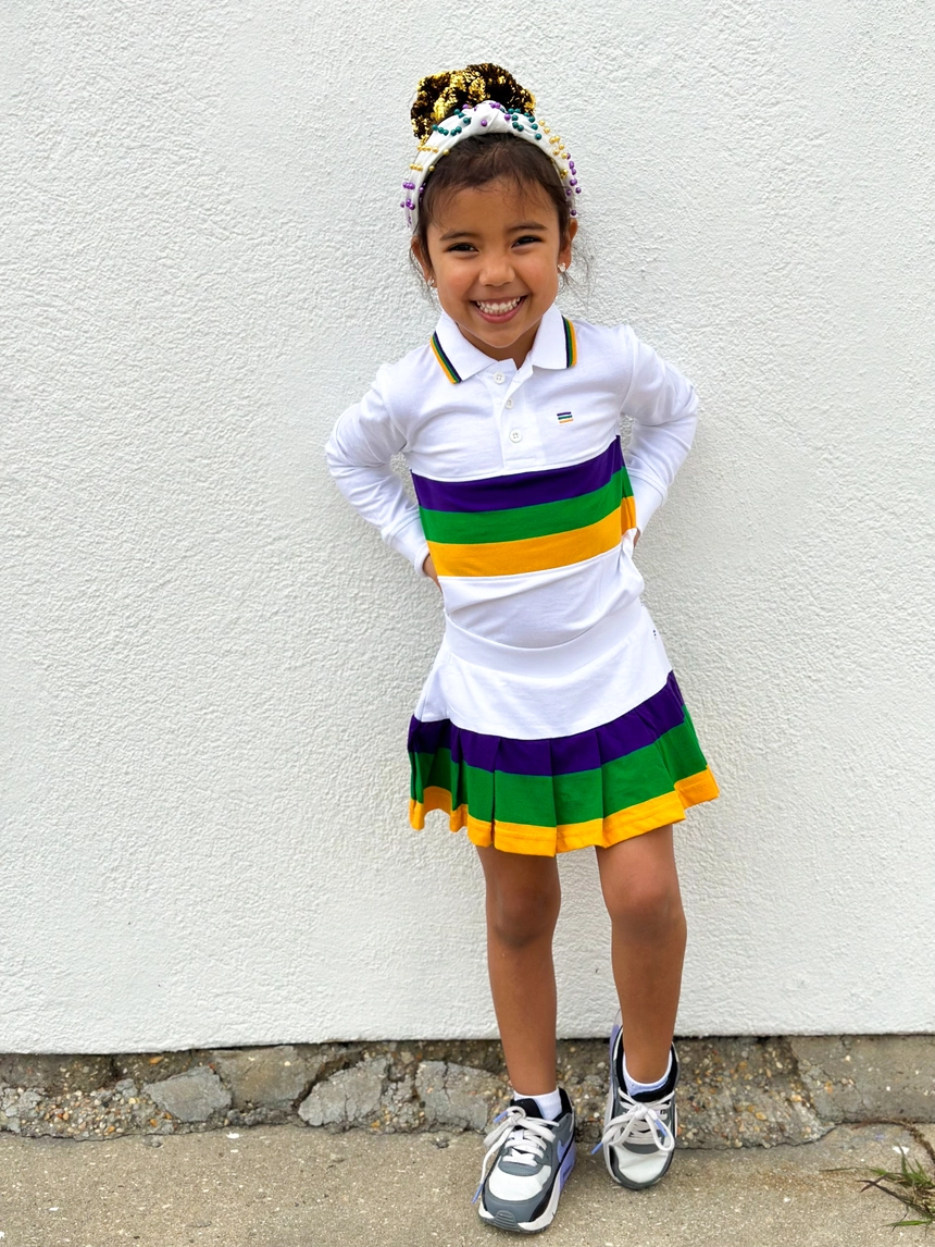 Look cute and stay cool with our Pleated Youth Skorts in White! Perfect for effortless Mardi Gras style, this pleated skort features purple, green, and gold stripes that give off major preppy vibes. Get it now and be the life of the party. 🎉