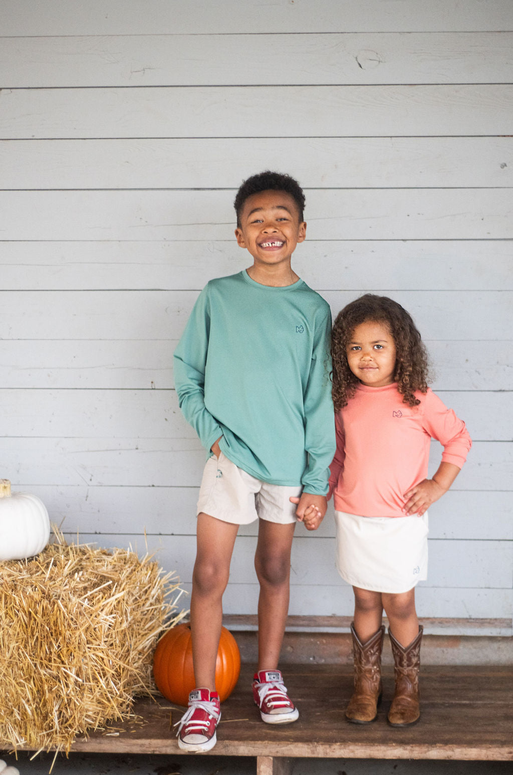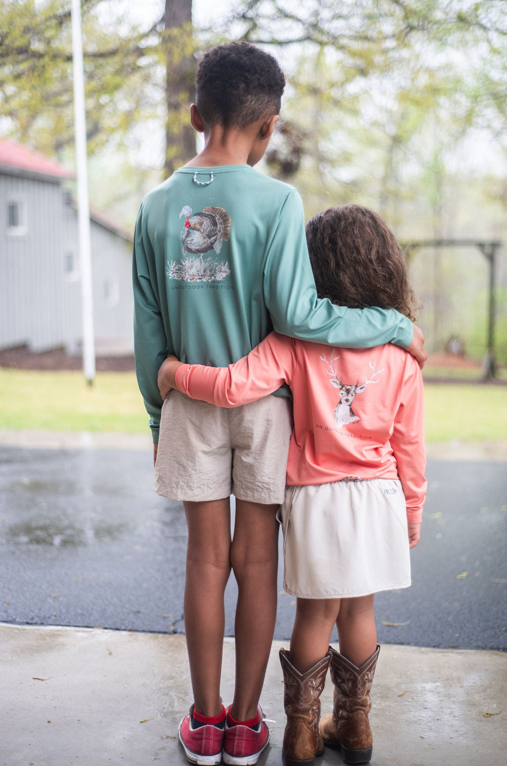 Let your little adventurer embrace the great outdoors in style with Prodoh Kid's Pro Performance Long Sleeve T-shirt in Soft Orange with Deer Head and Antlers. Hand painted deer graphic with antlers and the phrase "An Outdoor Tradition", this shirt honors the spirit of nature while keeping kids cool and protected from the sun. Great for family hikes, school field trips, and weekends at the lake!