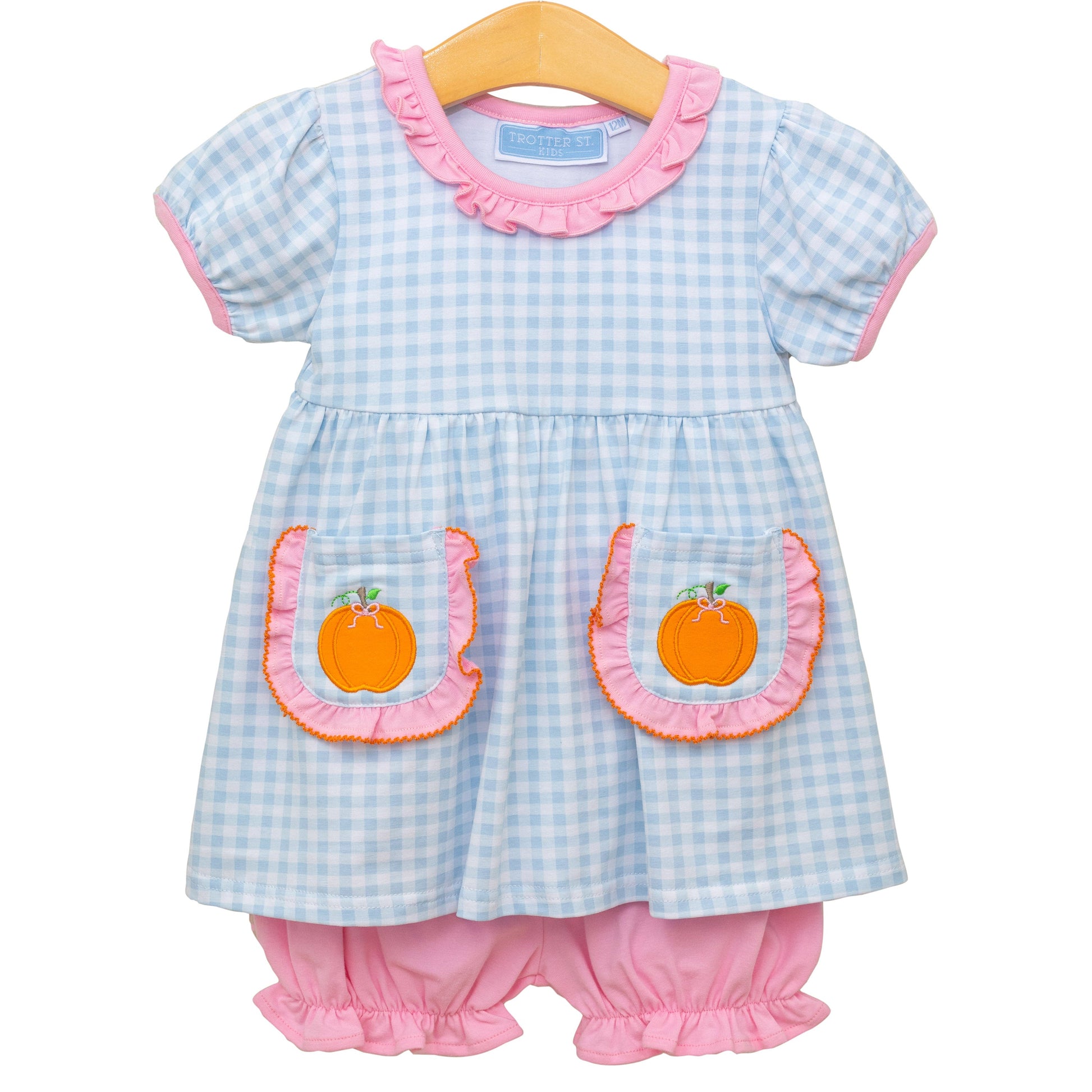The Pumpkin Short Sleeve Bloomer Set from Trotter Street Kids is a playful celebration of fall wrapped in pastel charm. This two-piece set features: