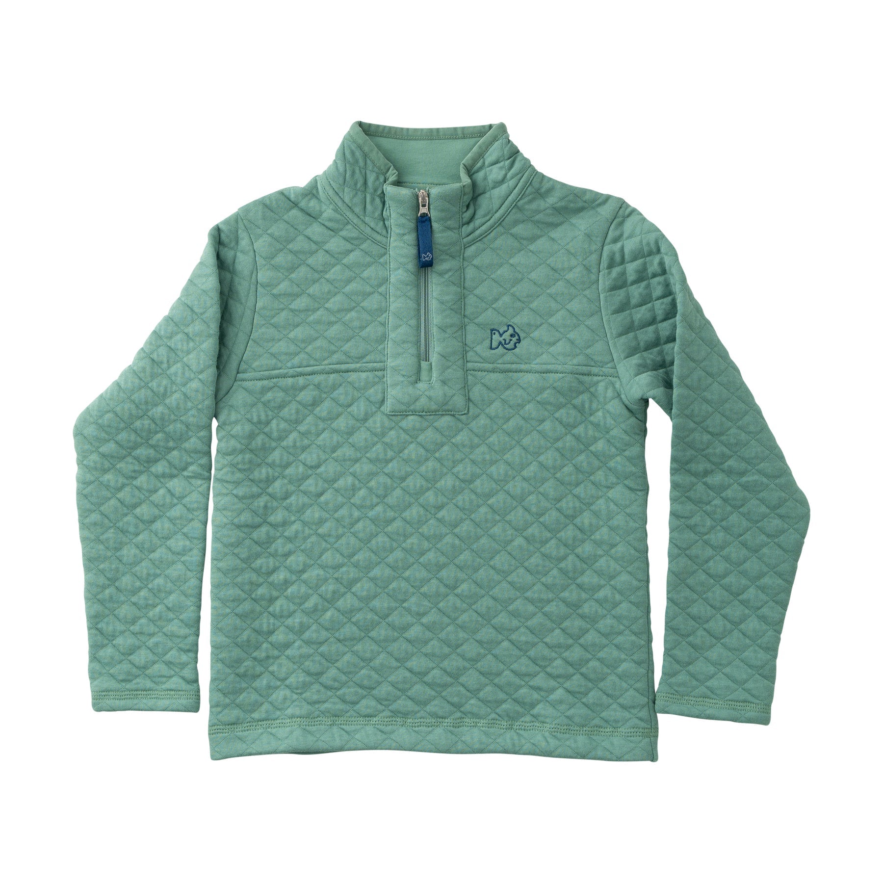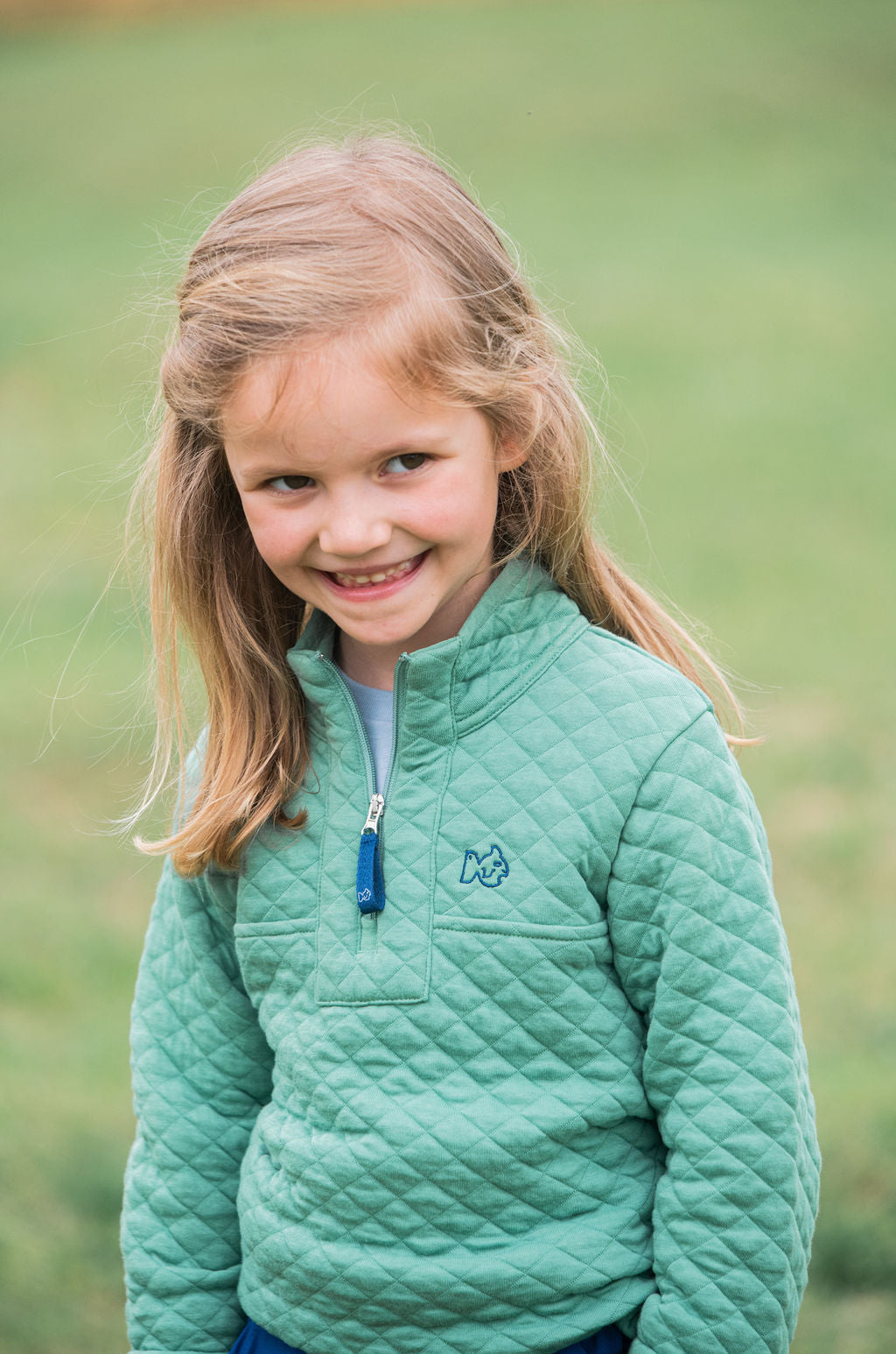 Built for play, polished for everyday - Prodoh Kids Quilted Zip Pullover in Frosty Spruce Green delivers all the cozy vibes with zero fuss. Made from a soft quilted cotton and polyester blend and finished with our iconic fish logo, this layer is as durable as it is adorable. Pair with matching joggers for an effortlessly polished playtime look. Comfort, durability, and classic Southern style-this pullover has it all!