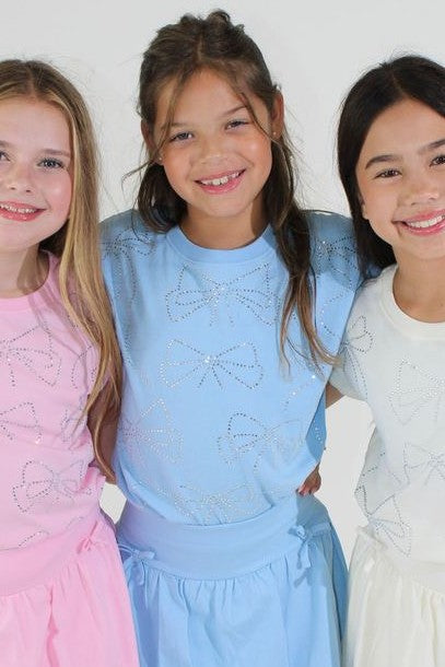 Tween girls cotton top adorned with multiple rhinestones bows.