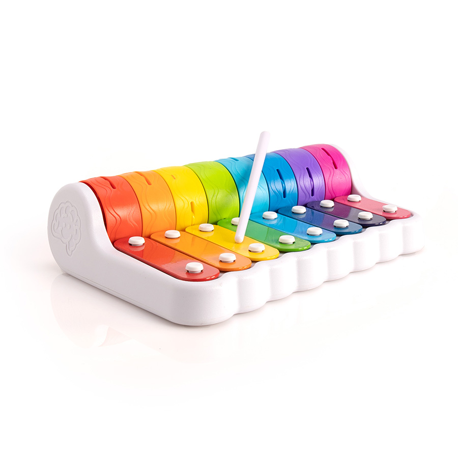 - Encourages fine motor skills, hand-eye coordination, early music learning