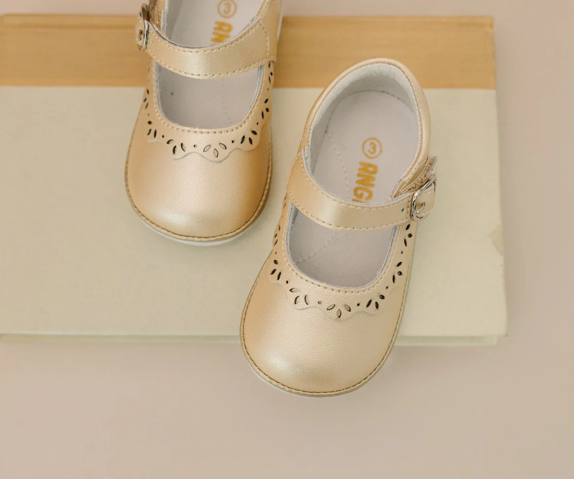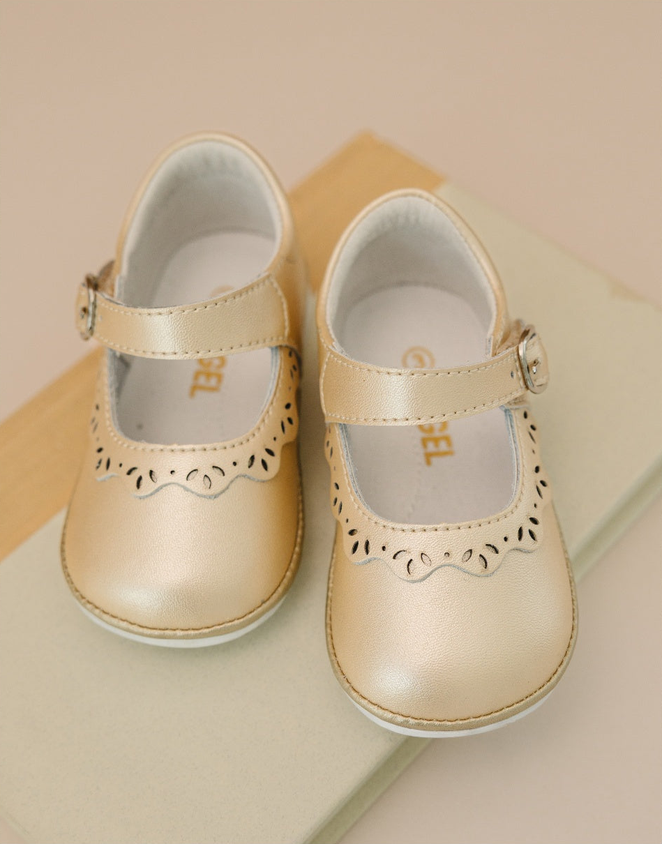 Vibrant in metallic glow, look to the Rosie for a lit up look. This lovely shoe features an appleseed design along the front. Keep up with moments from apple season to holiday fetes and beyond with this one.