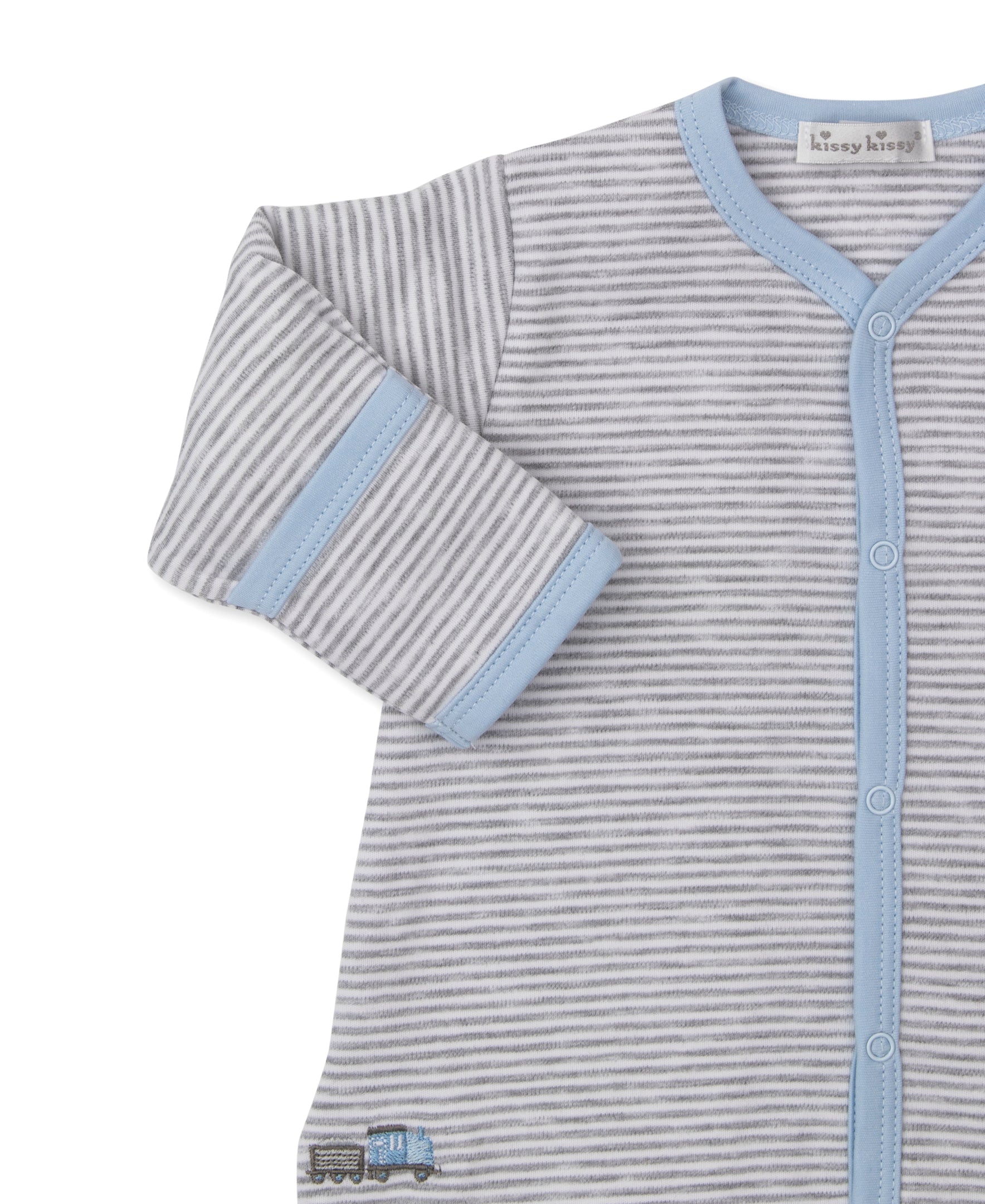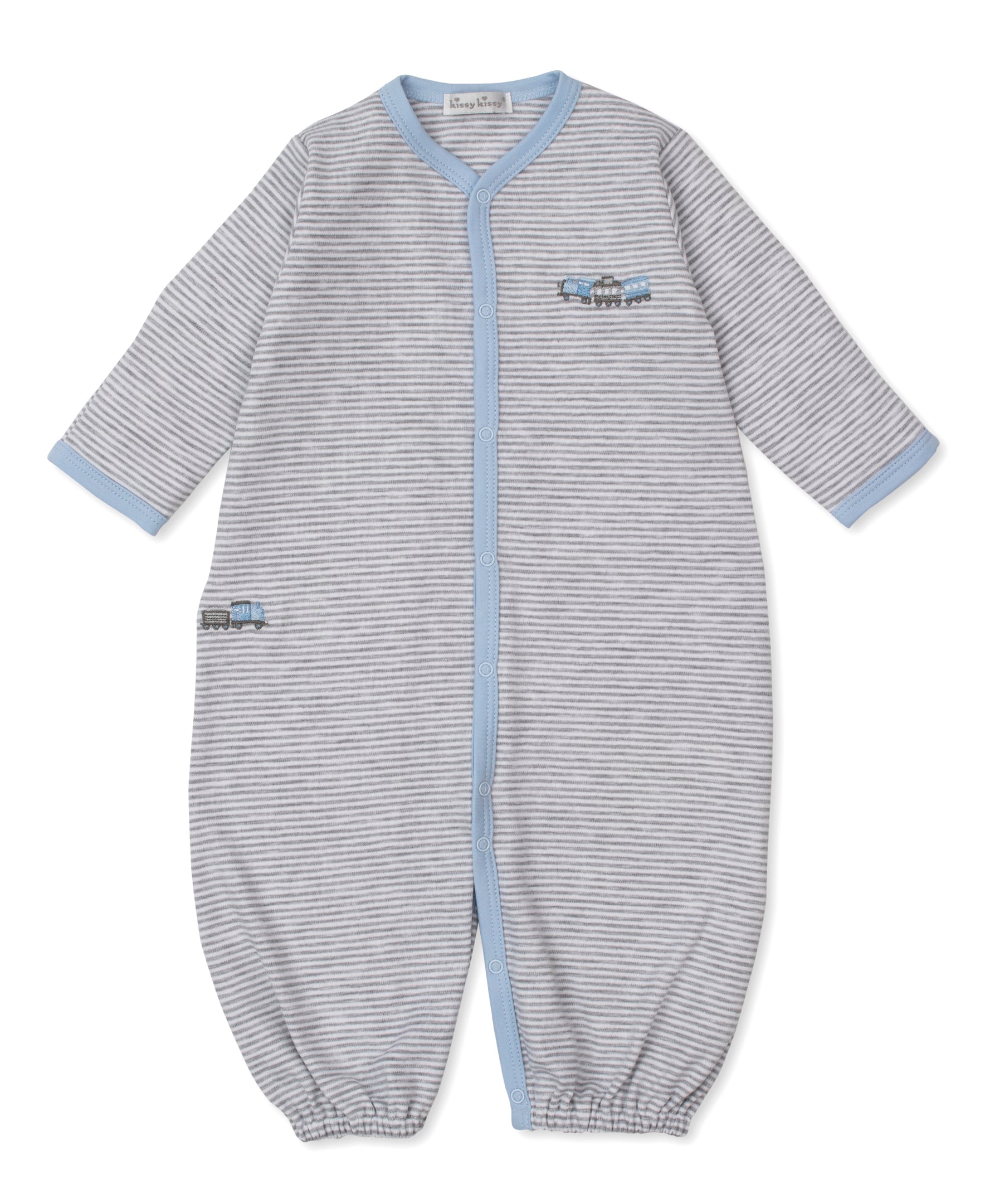 Classic comfort meets playful detail in this soft, striped converter gown—ideal for newborns who love to snuggle in style. Crafted with gentle cotton and accented by soft blue trim, this piece is as practical as it is precious. The embroidered trains add a whimsical touch for little ones on life’s first adventure.