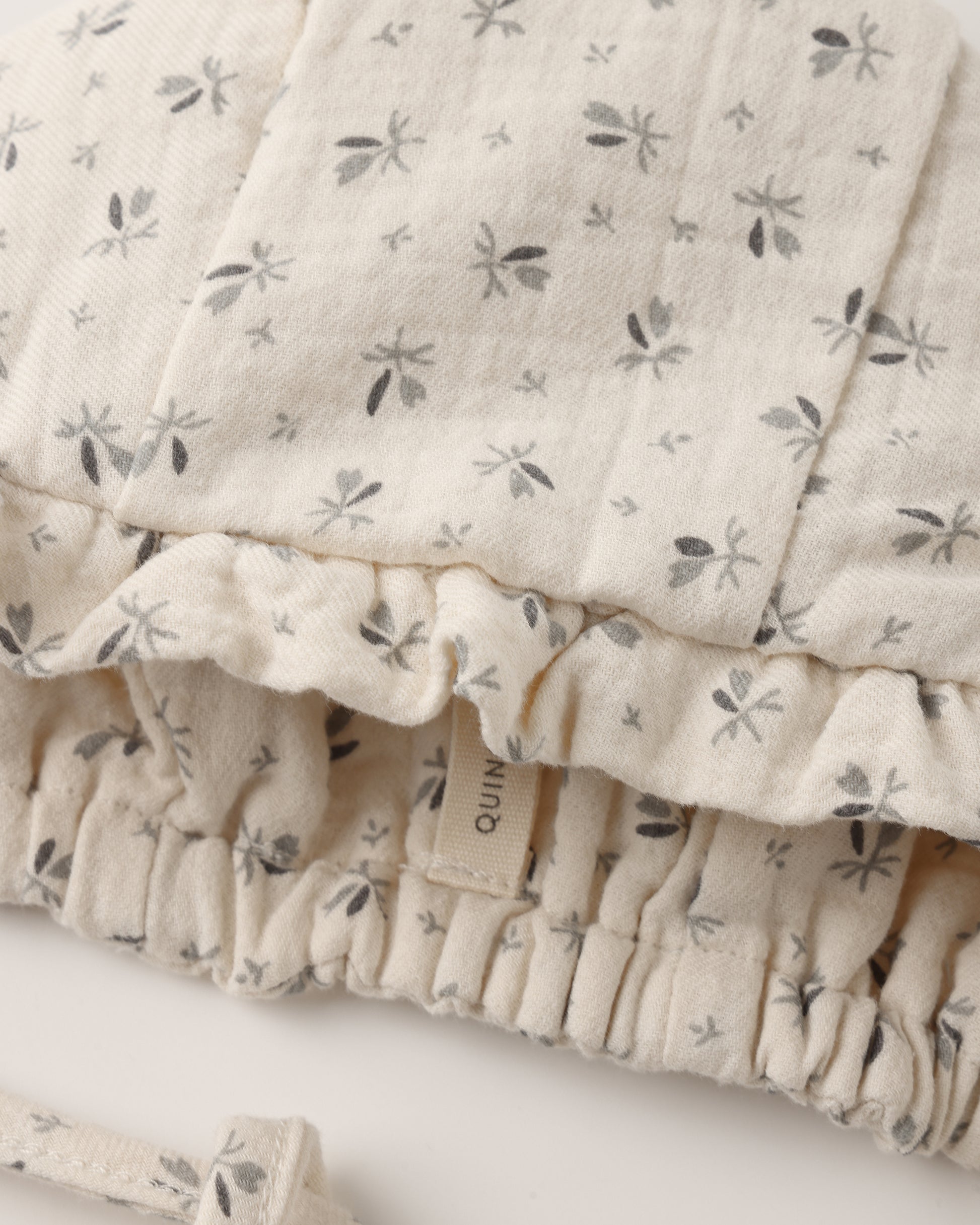 Organic cotton gauze baby bonnet with delicate ruffle trim, ties at the chin, and elastic at the back neck for a soft, secure fit.