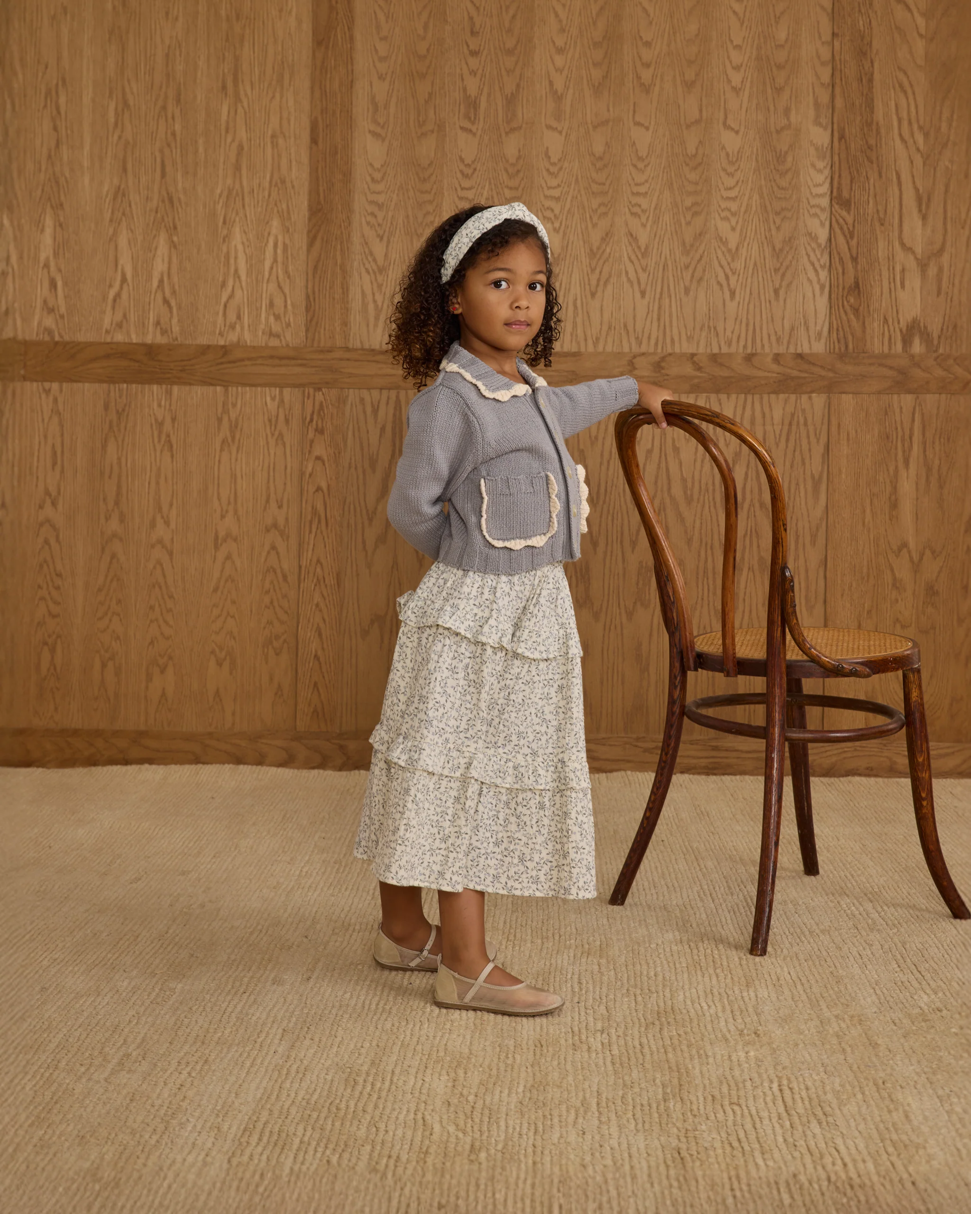 This midi skirt features tiered layers with delicate ruffle trim and a comfortable elastic waistband.