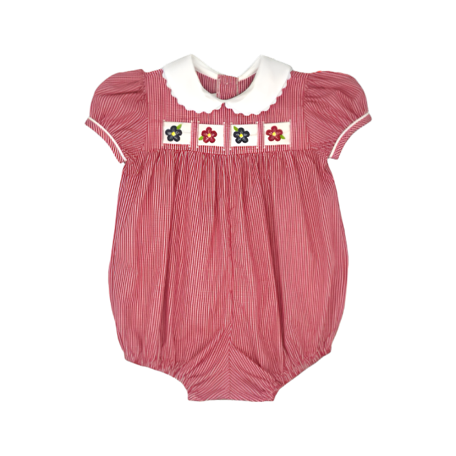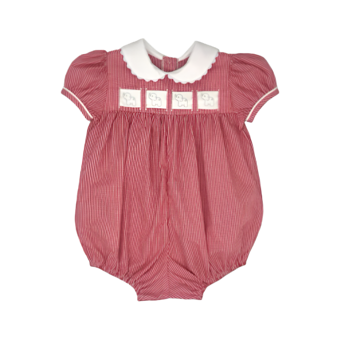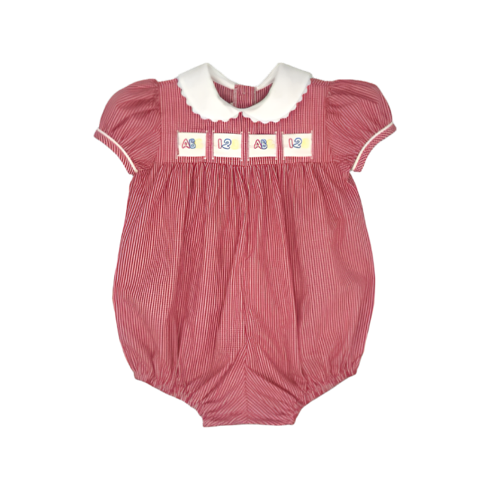 Lullaby Set's Ruth Ribbon Bubble is a Lullaby Set classic. This timeless bubble is back this season Ridgeland Red Minigingham with white ric rac trim on the collar. The interchangeable ribbon detail that weaves across the front of the bodice makes this a versatile bubble appropriate for school days, everyday, and Christmas.