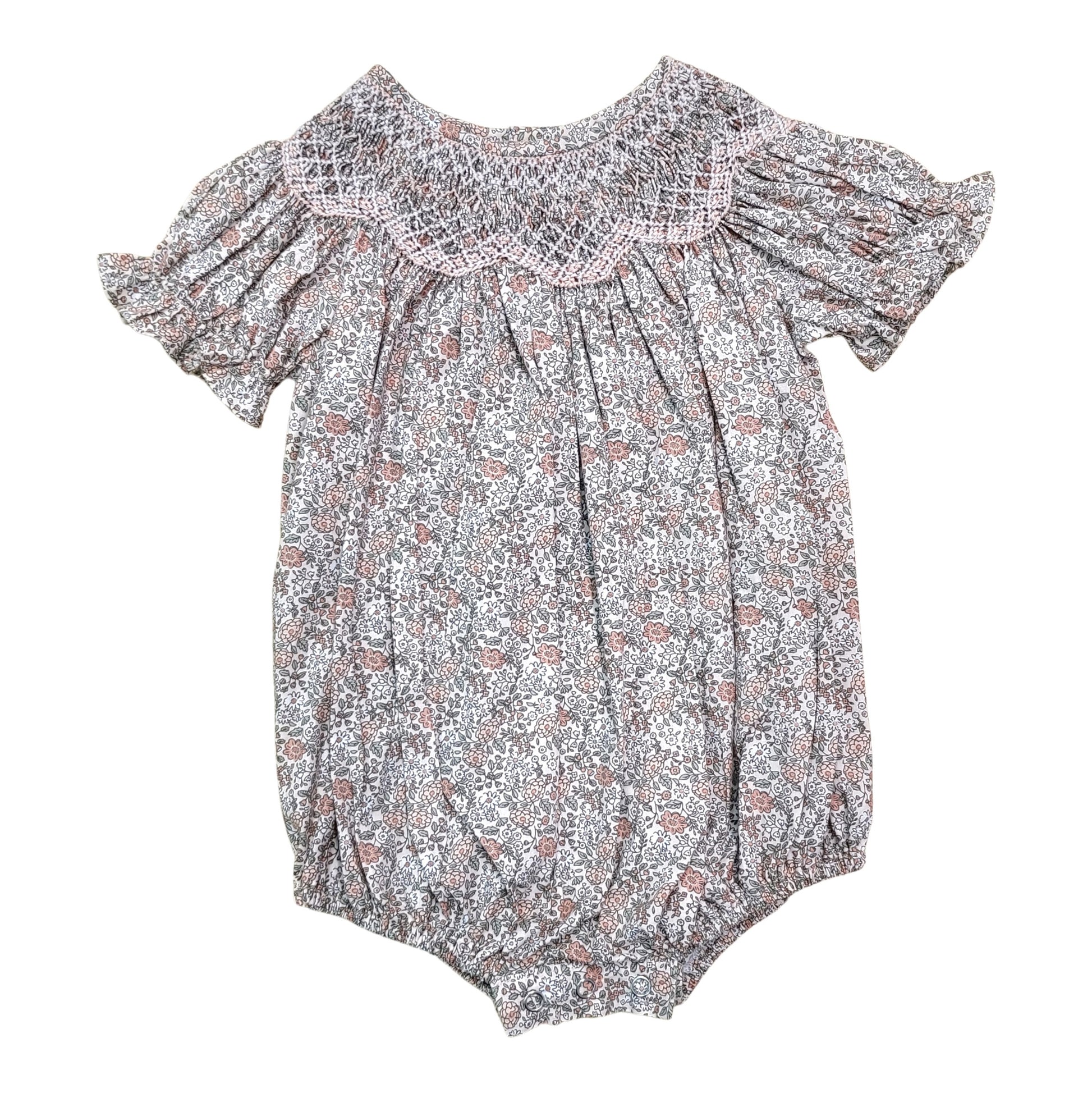 The Sabrina Peachy Pink Floral Bubble from Sweet Dreams is a darling blend of vintage charm and seasonal sweetness. With its soft floral print in shades of pink and white on a muted gray background, this bubble is designed for comfort, elegance, and heirloom-worthy style. The smocked neckline features delicate diamond stitching, while puffed sleeves and elastic leg openings create a cozy, classic silhouette perfect for sunny strolls and springtime snapshots.