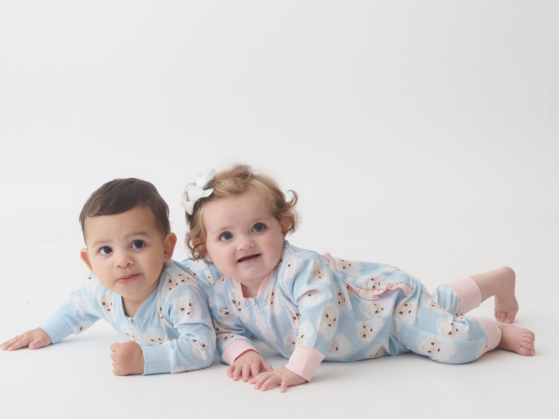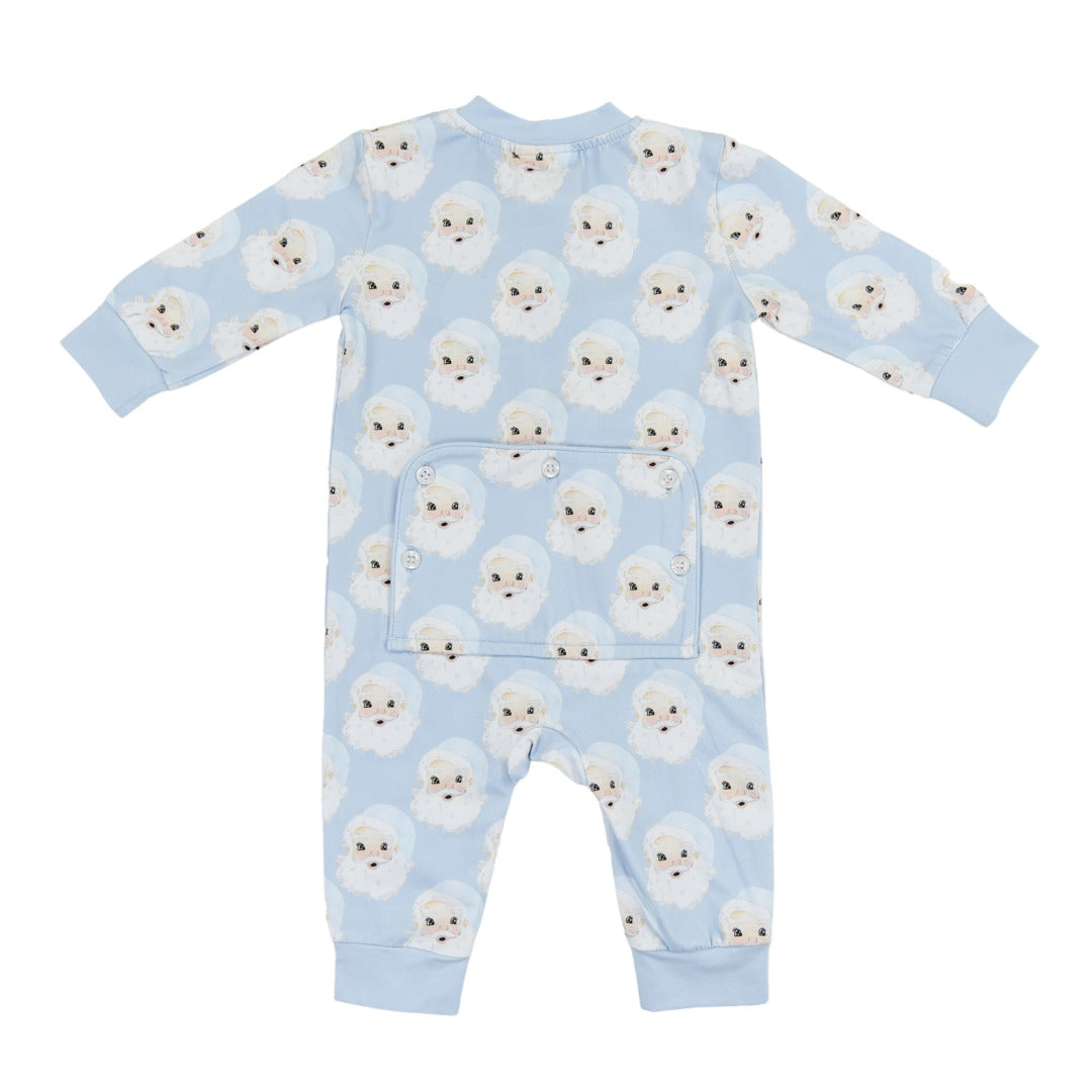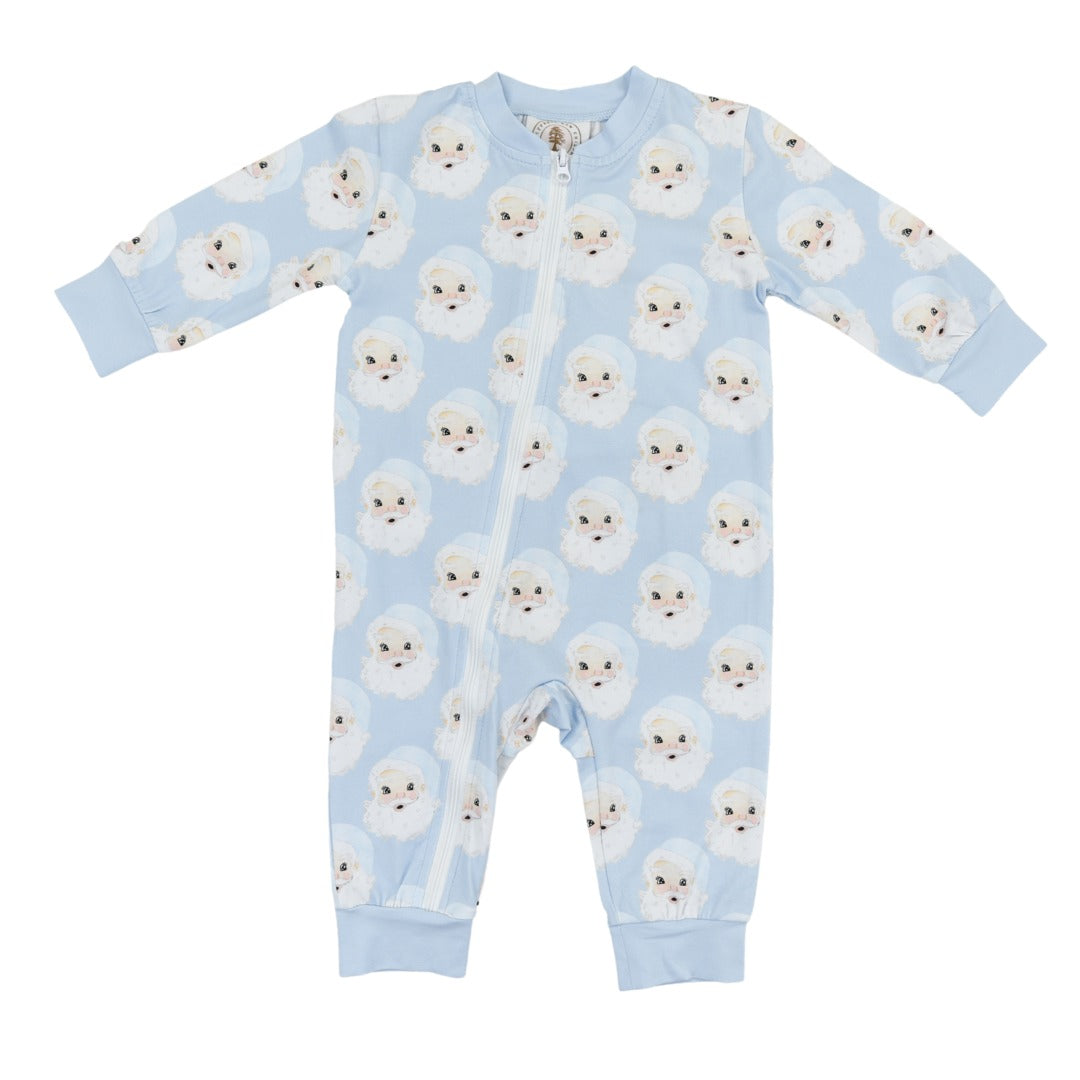 Wrapped in whimsy and ready for reindeer games, the Santa Baby Boys Zippy Lounge from Cypress Row is a cozy classic with a cheerful twist. This long-sleeved romper features a repeat pattern of jolly cartoon Santas set against a wintry blue backdrop, bringing festive fun to every snuggle and snooze. A full-length zipper makes changes a breeze, while ribbed cuffs in a deeper blue keep things snug and stylish. Whether he’s dashing through the house or dreaming of sleigh bells, this lounge piece is made for merry little moments.