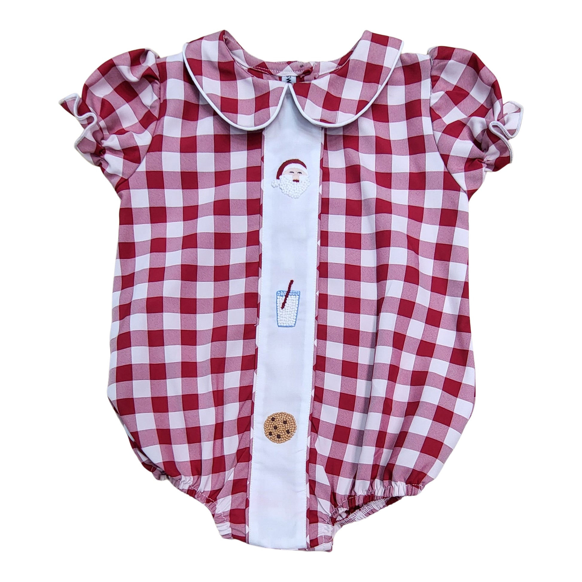 The Santa & Cookie Embroidered Girl Bubble from Sweet Dreams is a festive favorite with playful charm and vintage appeal. Made in red and white checkered fabric, this bubble features puffed short sleeves, a Peter Pan collar with white trim, and a vertical white panel embroidered with Santa’s face, a holiday notepad and pencil, and a chocolate chip cookie. Designed with elastic leg openings and a button-back closure, it’s a cheerful choice for Christmas celebrations, cookie decorating, and seasonal snapshots.