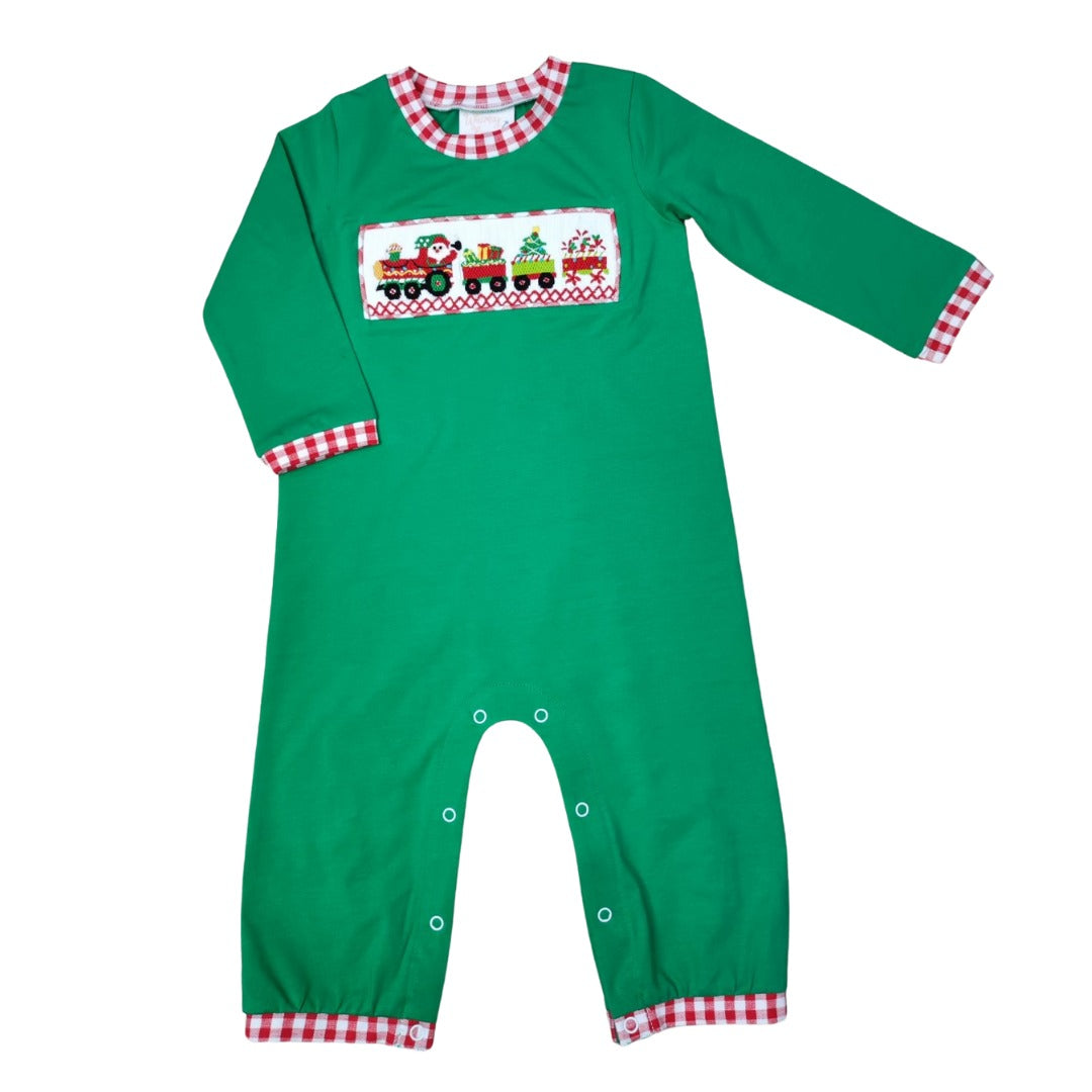 All aboard the festive express! This long-sleeve romper from Whimsy Bay Kids is a holiday favorite with vintage charm. Dressed in rich green and trimmed in cheerful red gingham, it features a whimsical train appliqué complete with Santa, presents, and a sparkling tree. Snap buttons down the legs make changes easy, while the cozy cotton keeps little ones comfy from cookie time to caroling.