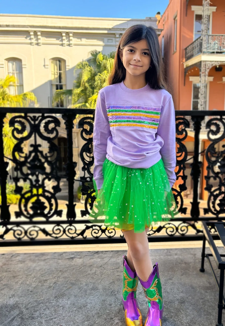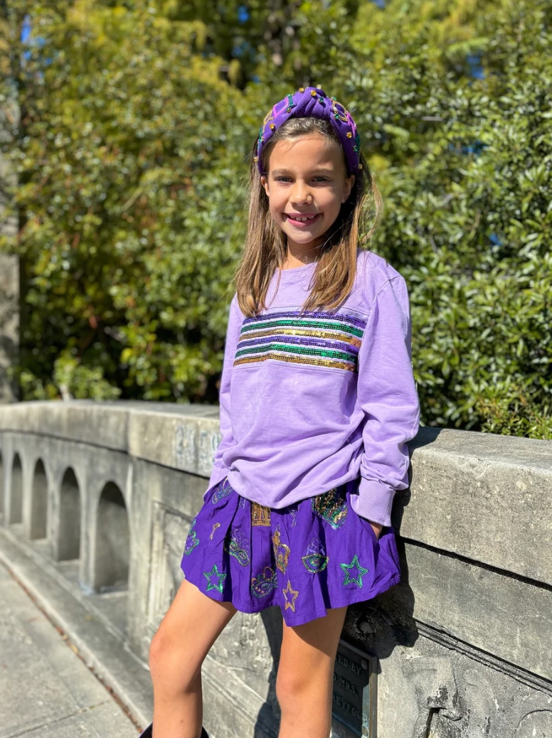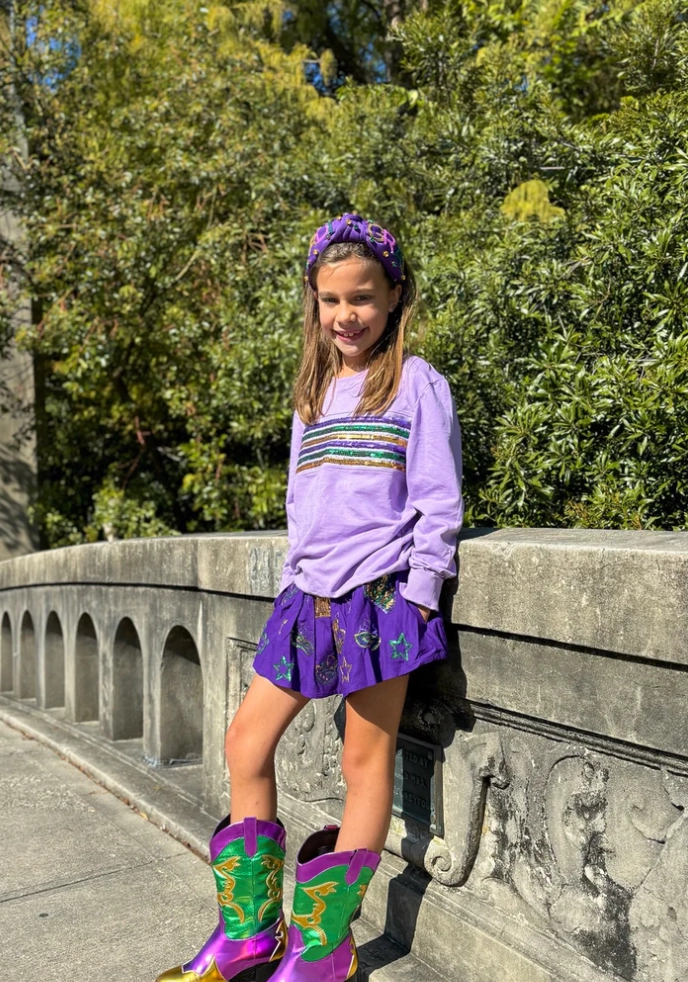 Add some sparkle to your child's wardrobe with this lavender long sleeve. Featuring playful purple, green, and gold sequin stripes across the chest, this top is perfect for any Mardi Gras celebration. Complete the look with our matching joggers or skort.