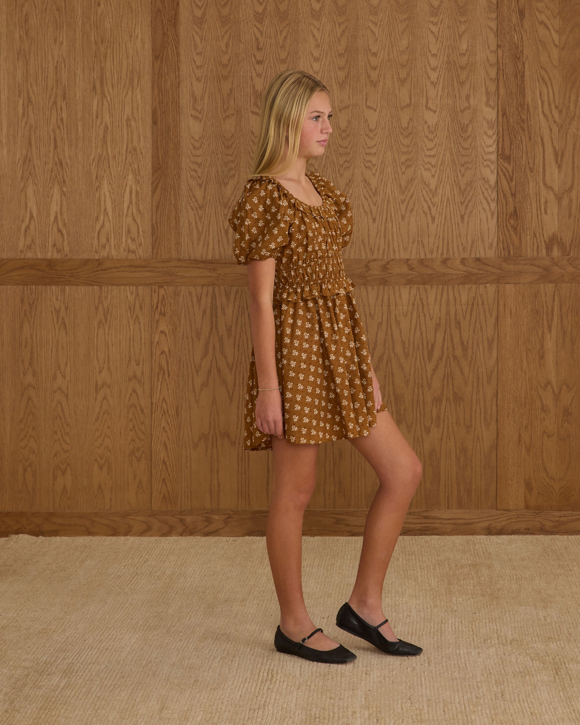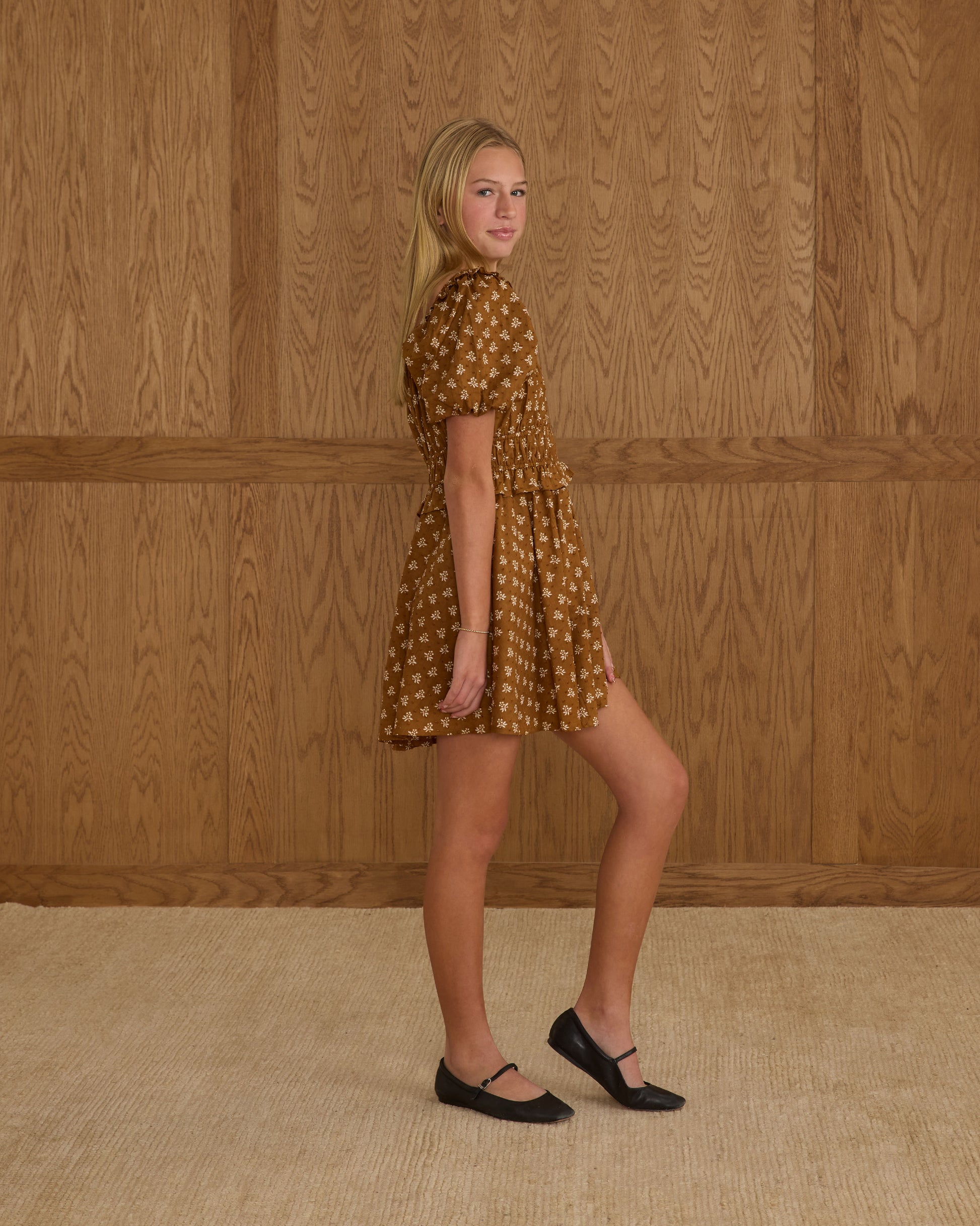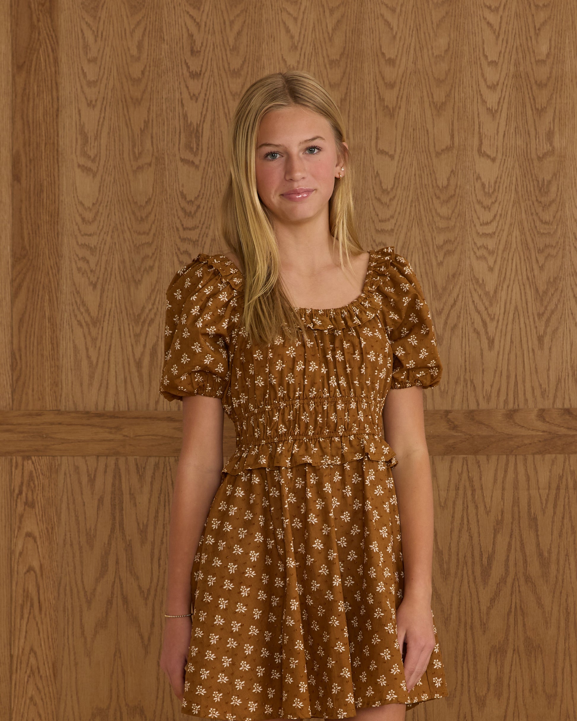 Rylee + Cru's Shayla Dress features gathered smocking along the bodice, with delicate ruffle trim at the neckline and waist for a feminine finish.