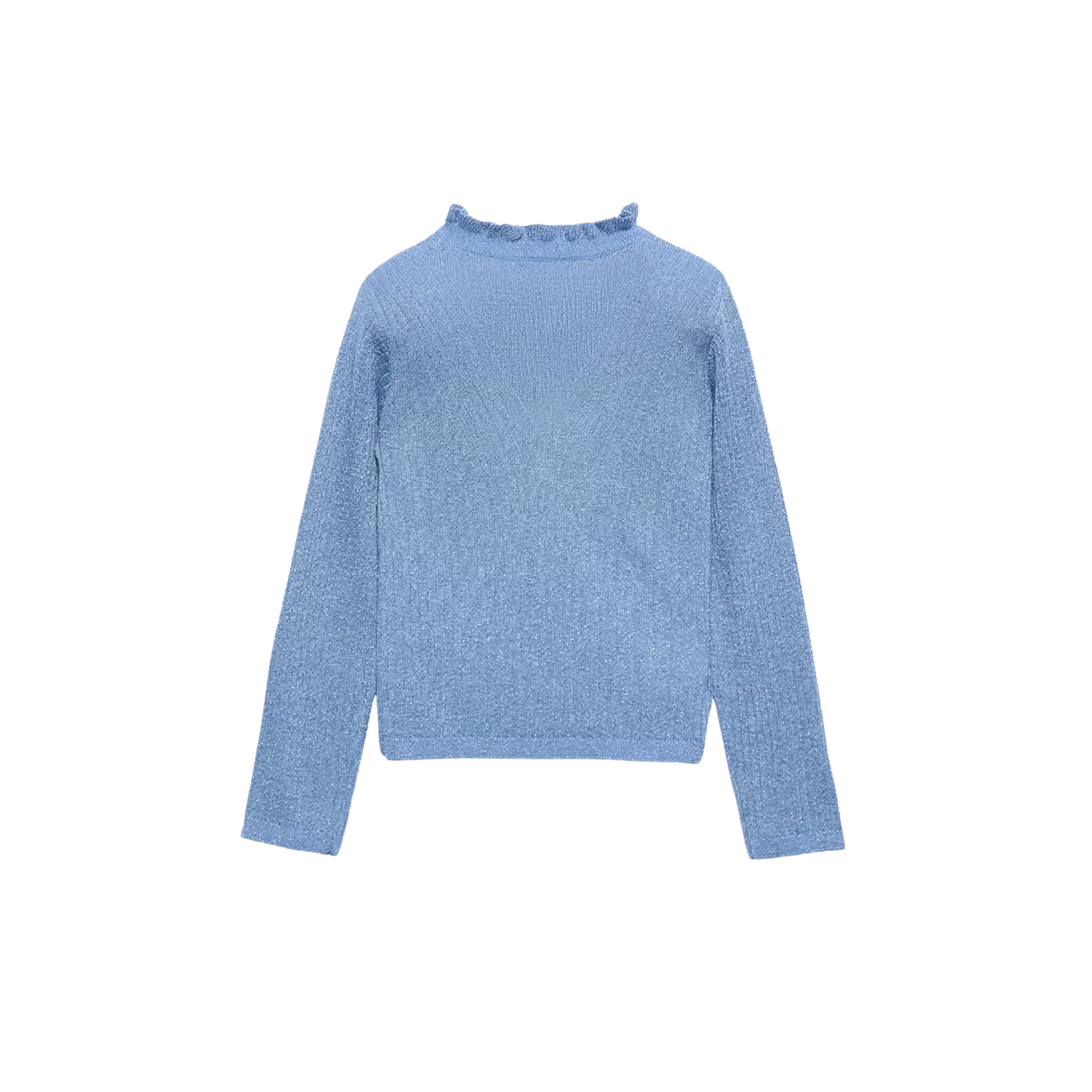 - Sky blue ribbed knit with subtle shimmer