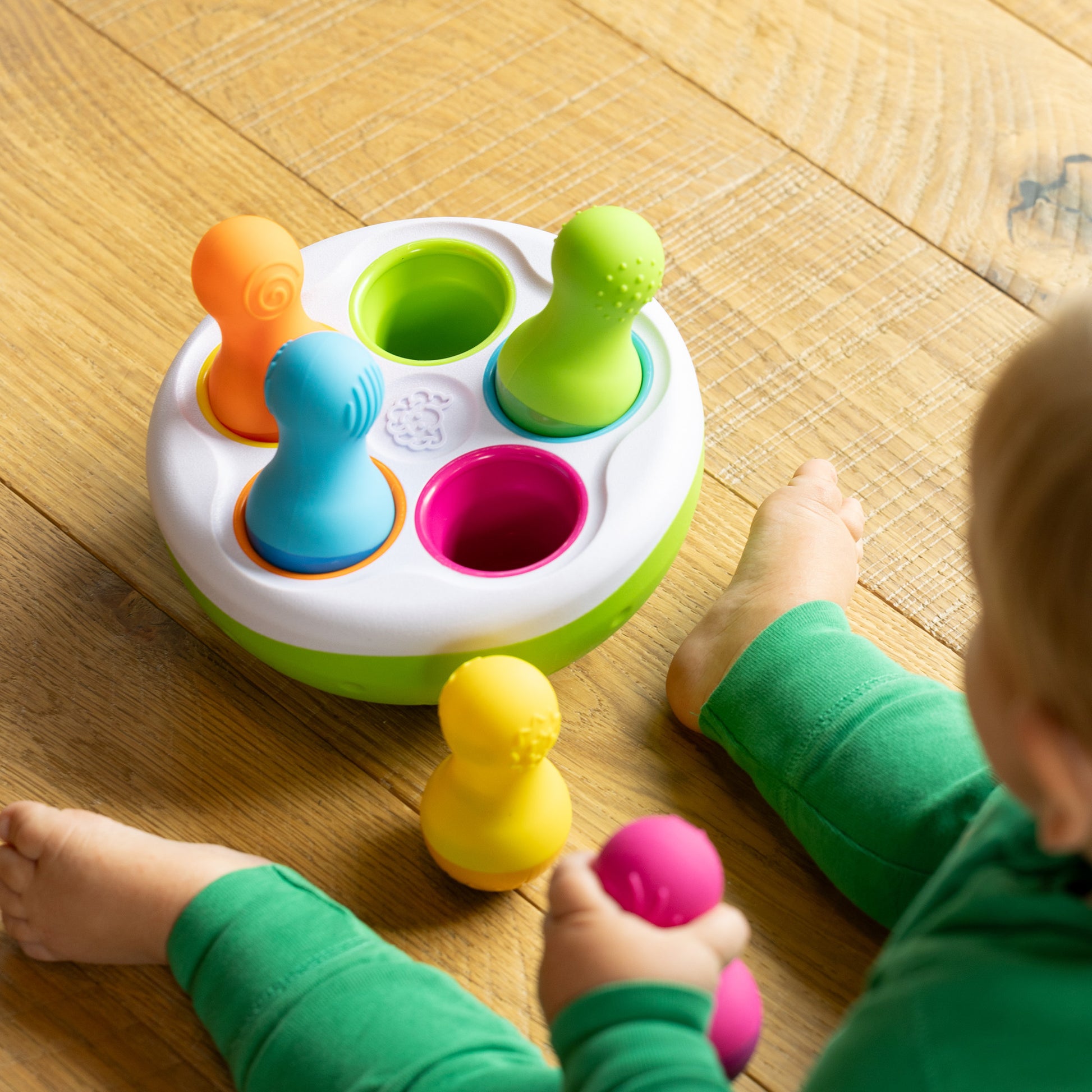Each of the five colorful pins features fascinating textures to feel plus a weighted base that wobbles wonderfully. Fit them into the slots of the big bowl either upside down or right side up, matching the colors as you go. On the bottom of the bowl is a bump that keeps it constantly tilted and inside is hidden a delightful chime. Experiment with balance and movement while keeping the senses enthralled! Little ones can't stop exploring SpinnyPins.