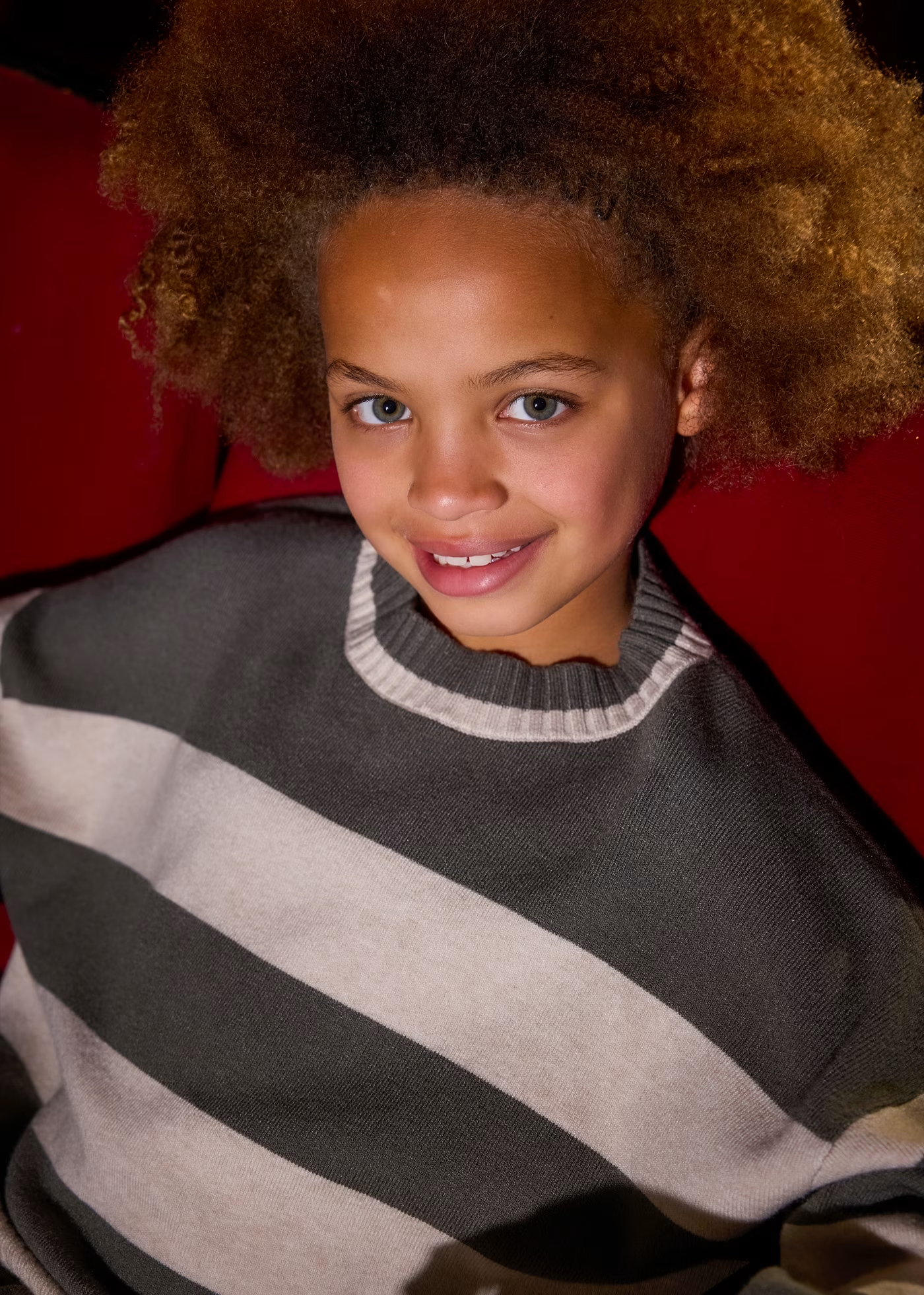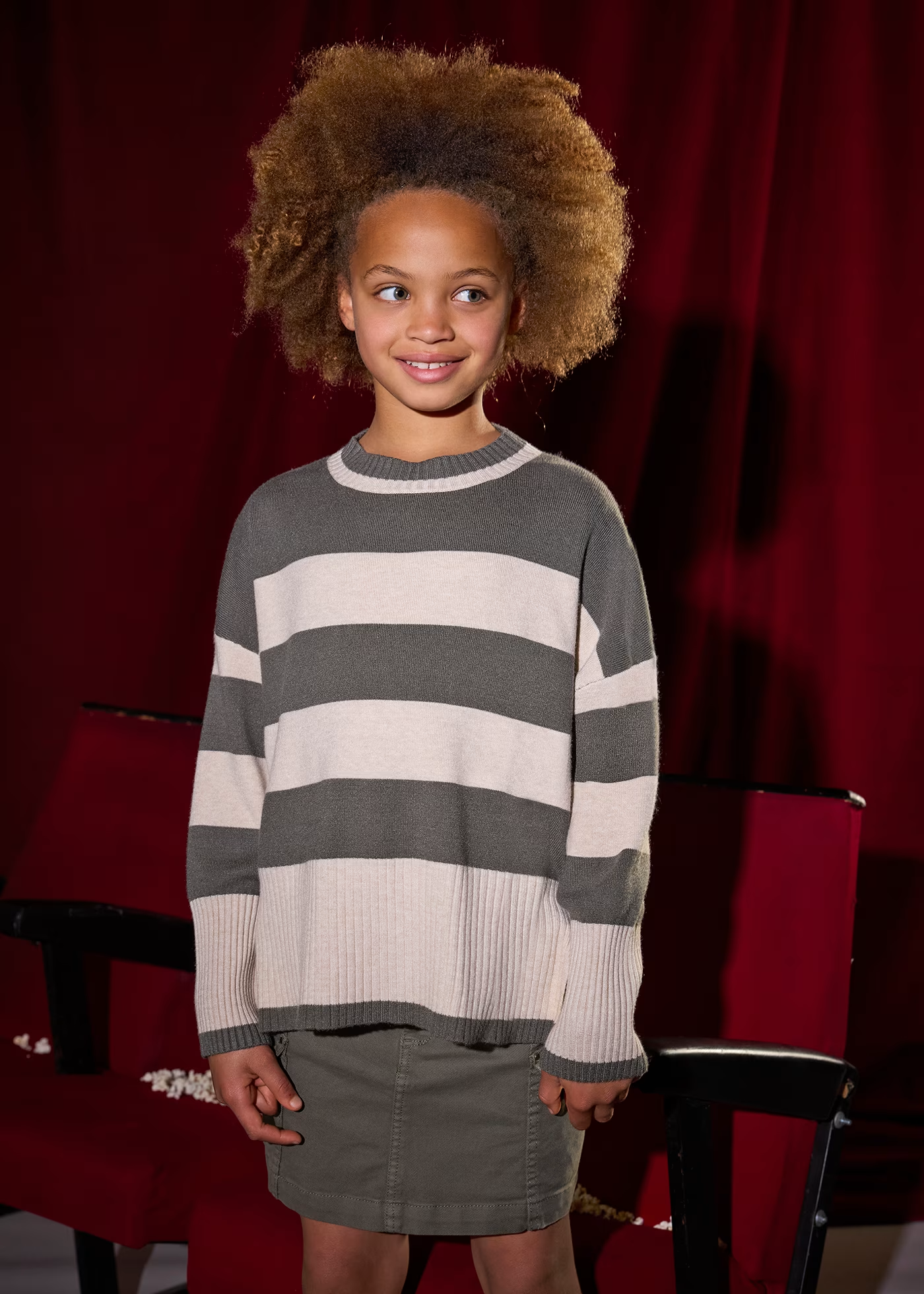 The Striped Knit Sweater from Mayoral is a cozy classic with a modern twist. Featuring bold horizontal stripes and a relaxed fit, this piece is perfect for layering through fall and winter.