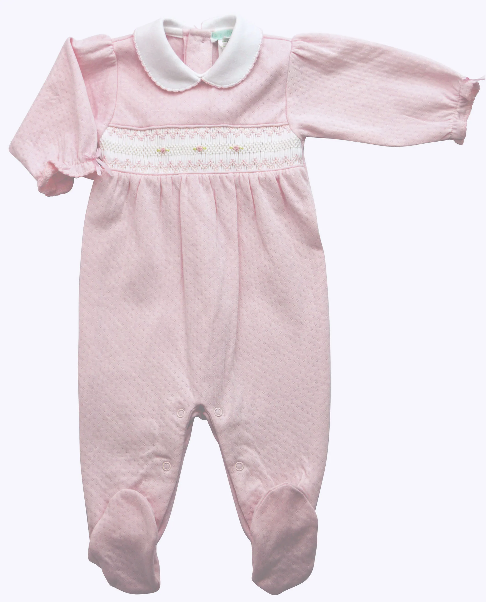 Soft, delicate, and oh-so-darling—this Sweet Pink Smocked Footie is a beautiful blend of comfort and charm. Our Pink Jacquard Smocked Footie wraps your baby girl in the softest Pima cotton, with a delicate jacquard texture that feels just as lovely as it looks. Hand smocking at the center is beautifully detailed with tiny embroidered rosebuds—adding just the right touch of charm for your little blossom.