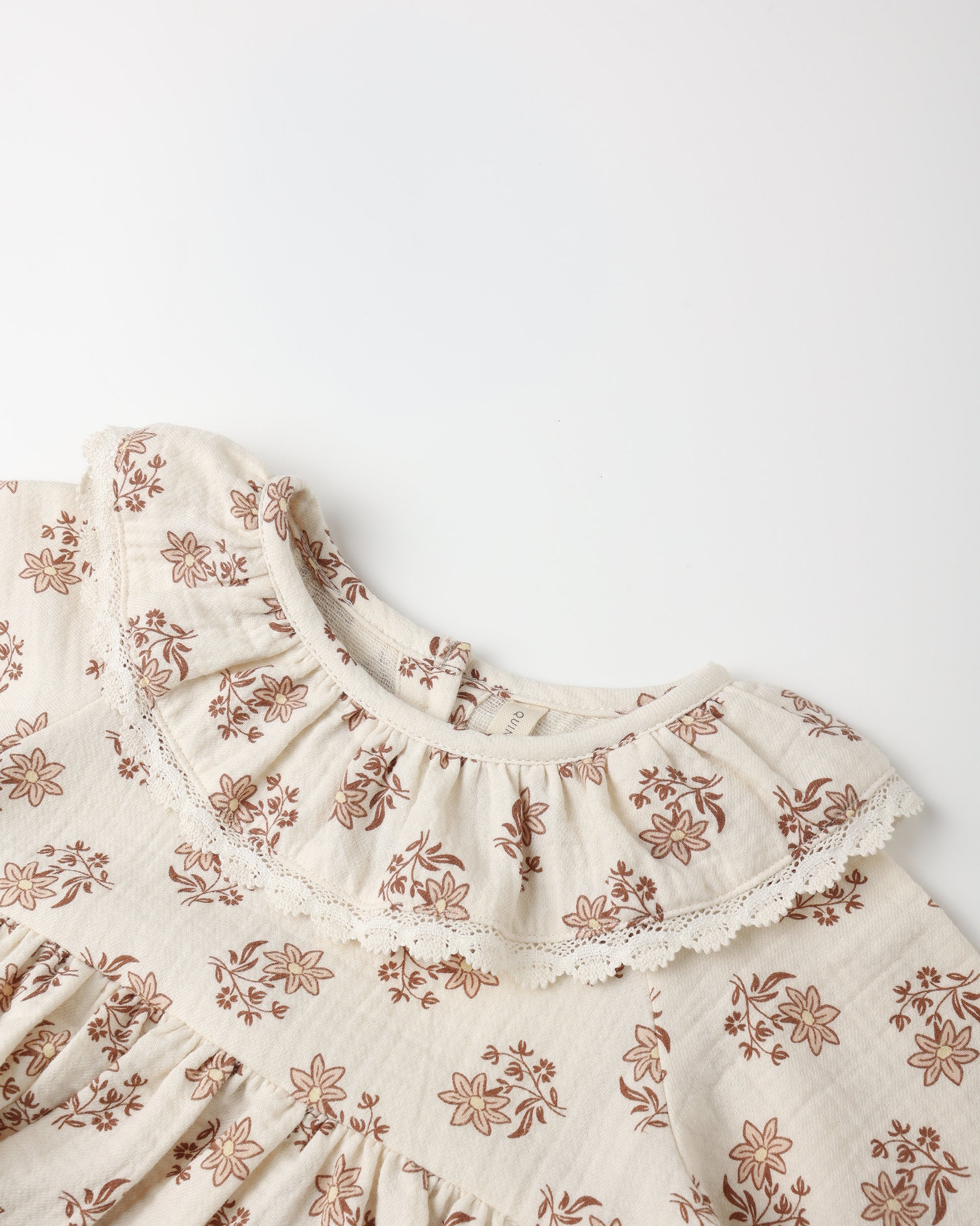 Quincy Mae's Thalia Romper features a sweet collar, delicate lace trim, a gathered waist, coconut buttons down the back, and bottom snaps for easy changes.