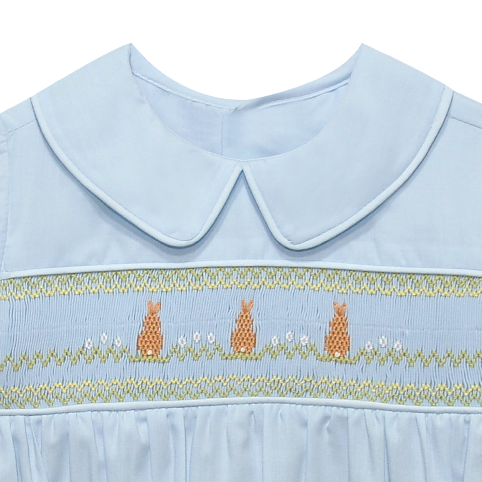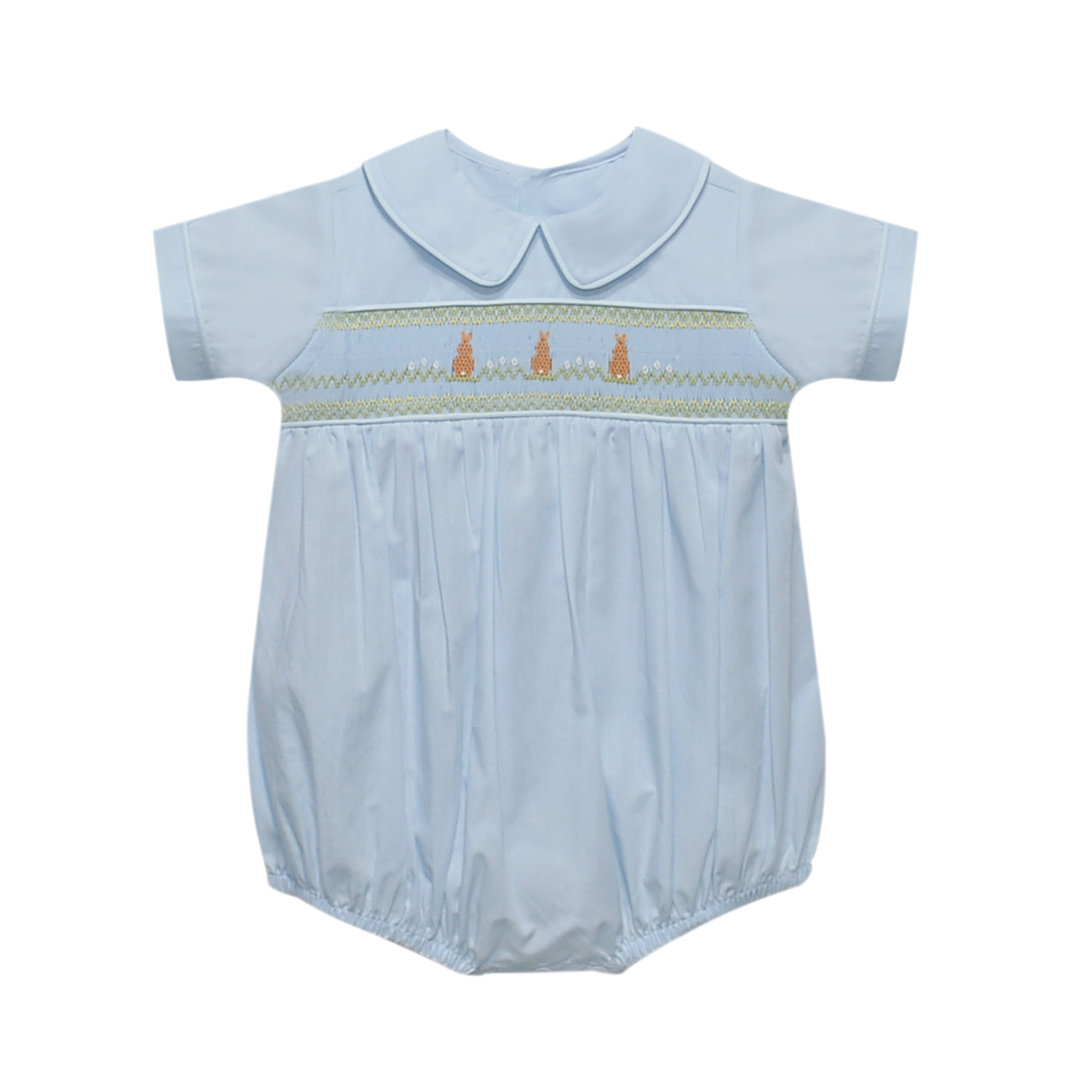 Hop into Easter fun with this adorable Thomas bubble featuring a cheerful blue design and smocked bunny details. Perfect for little ones celebrating the season, this charming piece from Remember Nguyen brings playful style to holiday photos and festivities. Pair it with the matching girl dress for coordinated sibling looks that capture the magic of springtime. Soft, comfortable, and bursting with seasonal charm, it's the perfect Easter outfit choice for your baby boy.