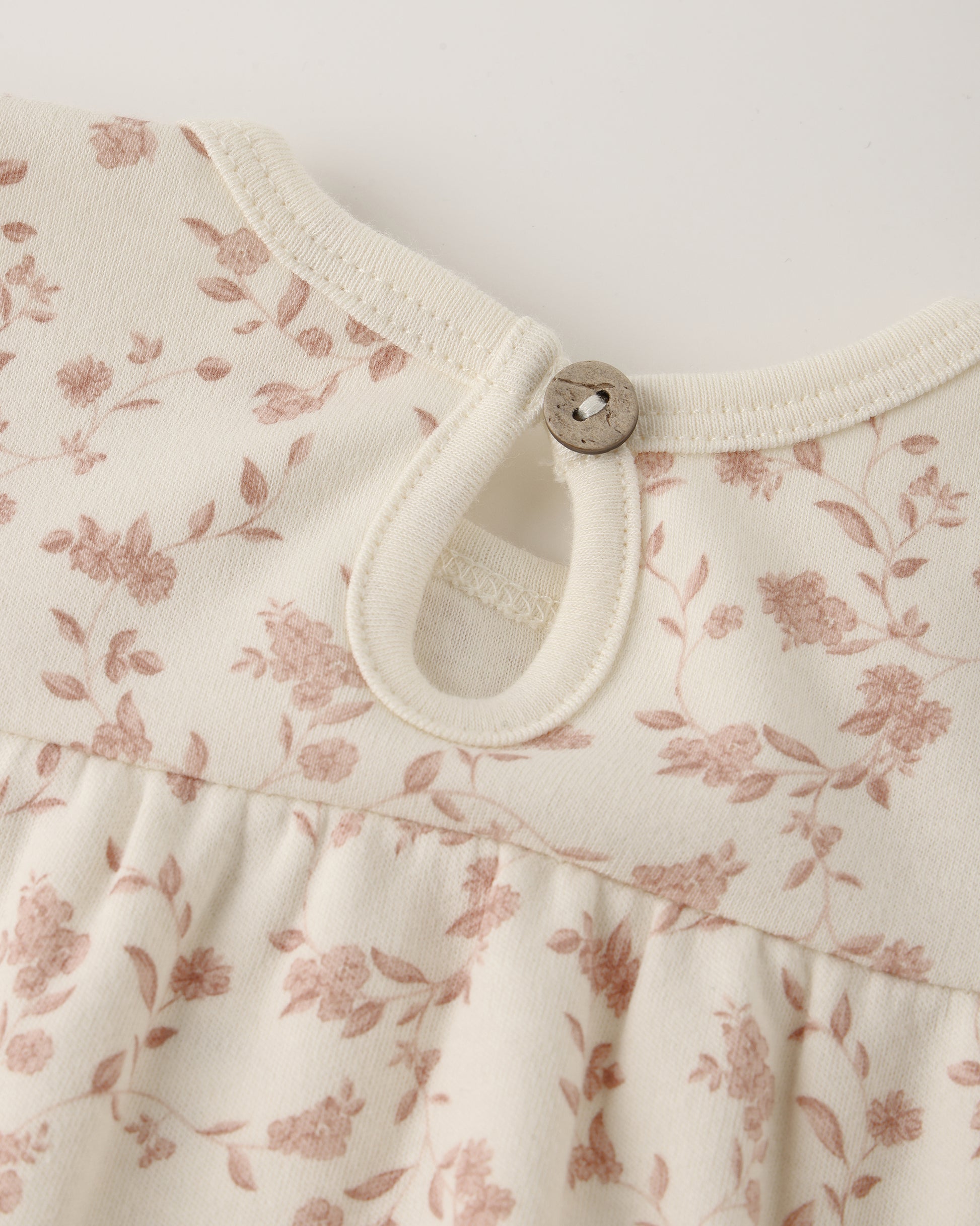 Long sleeve dress featuring soft tiered layers and a coconut button closure at the back. Coordinating bloomers included with all sizes.