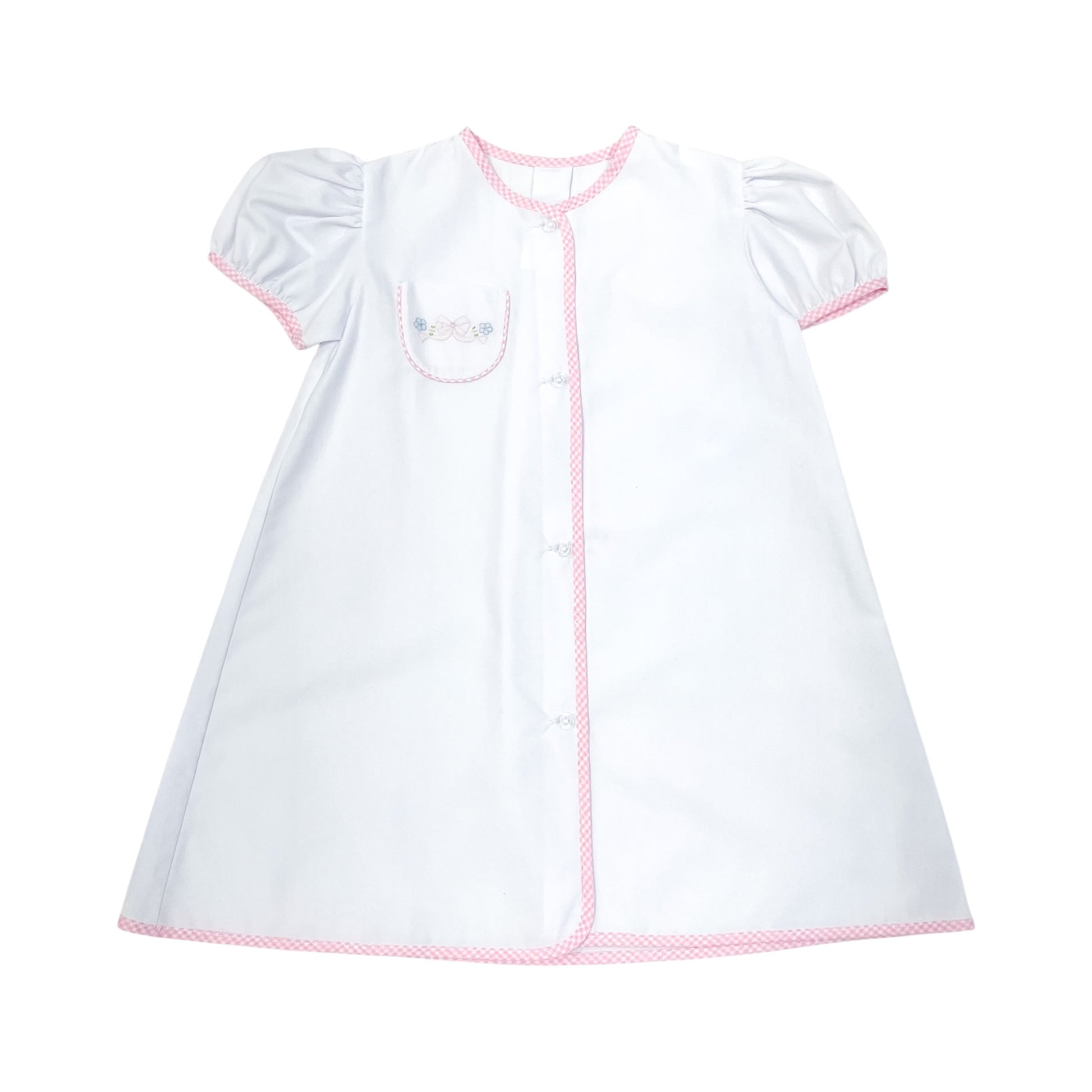 Introducing the Tiny Bows Daygown: a sweet and playful addition to your little girl's wardrobe. This baby daygown features delicate bow embroidery on the pocket and pink check trim, adding a charming touch to any outfit. Perfect for everyday wear or special occasions.