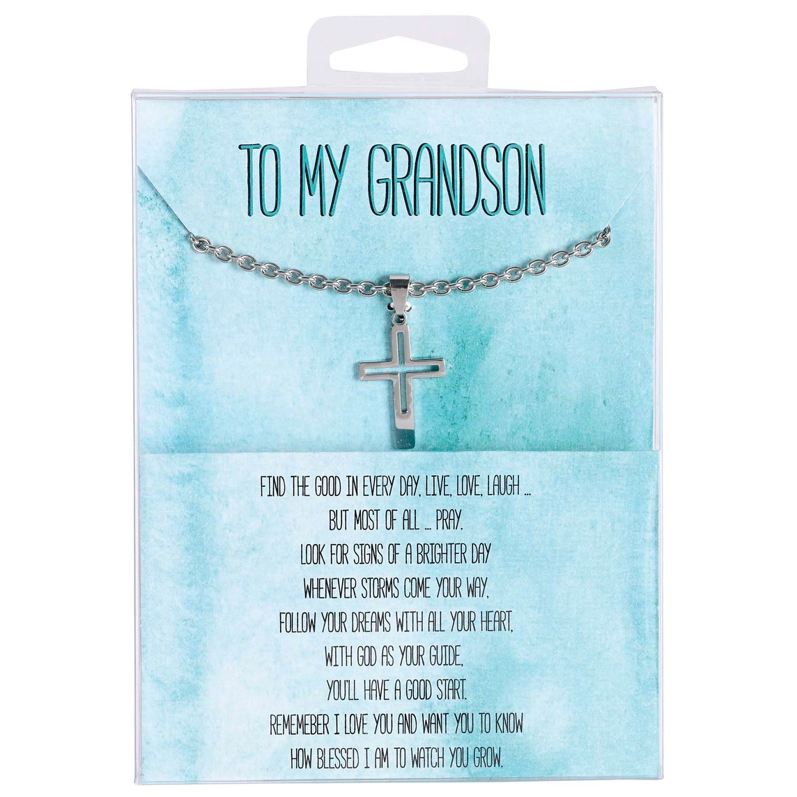 To My Grandson Cross With Cutout Cross Measures 1-1/8in L x 3/4in W And Hangs From An 18in Chain All In Stainless Steel. Comes Packed In A Clear Acrylic Box With Poem Insert That Reads: Find The Good In Every Day, Live, Love, Laugh … But Most Of All ... Pray. Look For Signs Of A Brighter Day Whenever Storms Come Your Way. Follow Your Dreams With All Your Heart, With God As Your Guide, You Will Have A Good Start. Remember I Love You And Want You To Know How Blessed I Am To Watch You Grow. Alda Maria Copyright Dicksons, Inc.